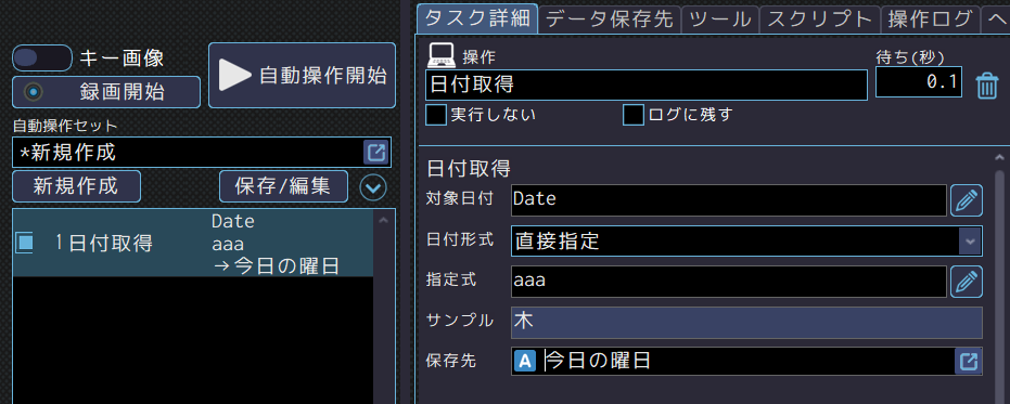 - 操作メニューの「関数/スクリプト」から「日付取得」の操作を追加