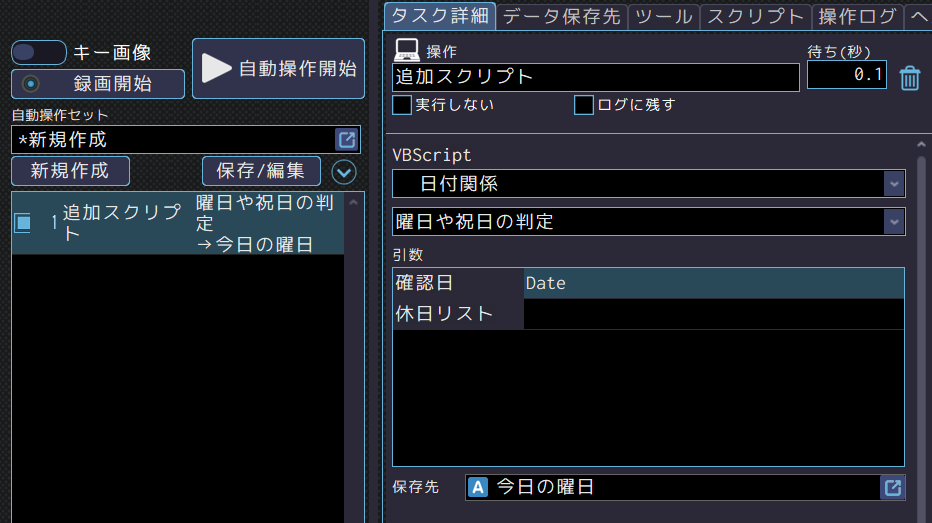 - 操作メニューの「関数/スクリプト」から「追加スクリプト」の操作を追加し、「日付関係」の「曜日や祝日の判定」を選択