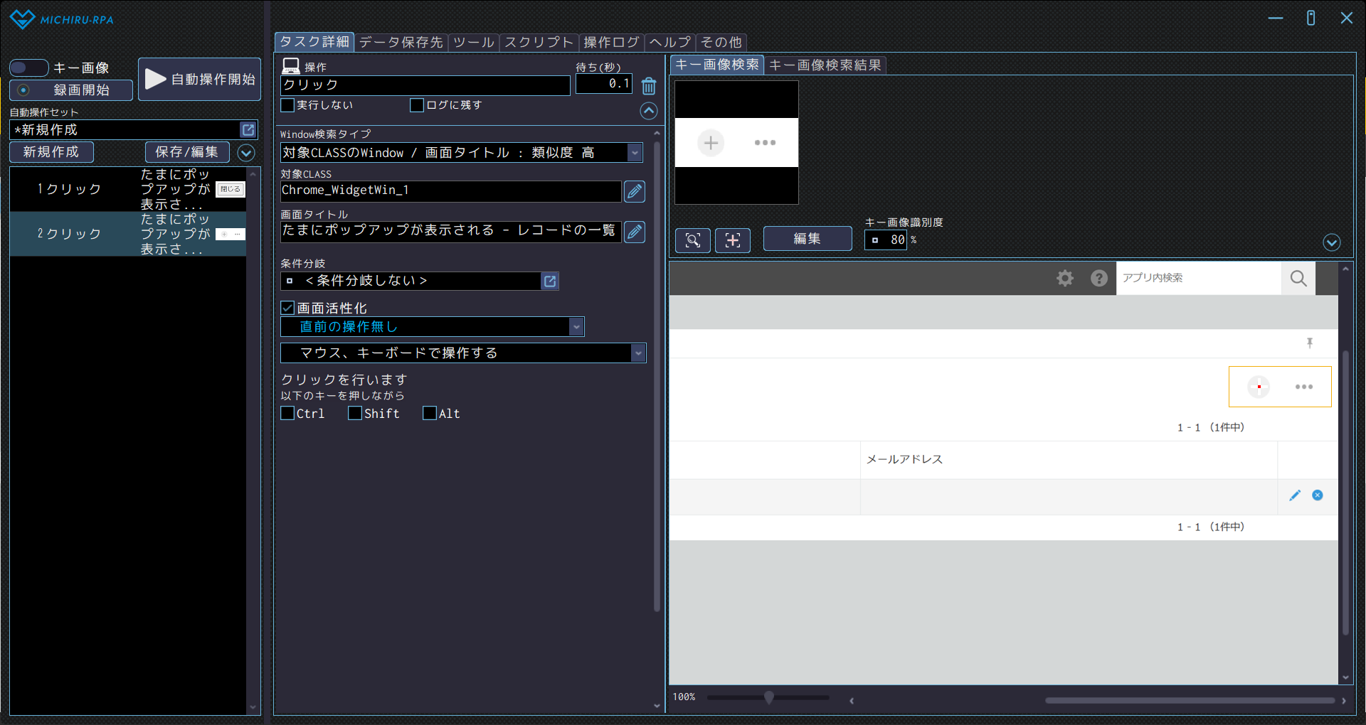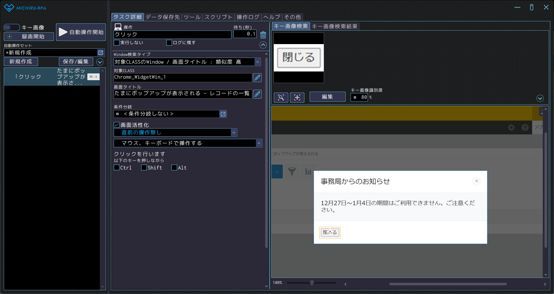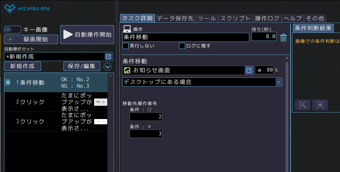その後、「条件移動」の機能を使って、画面上にその画像があれば閉じ、なければ何もしない、という設定をします。