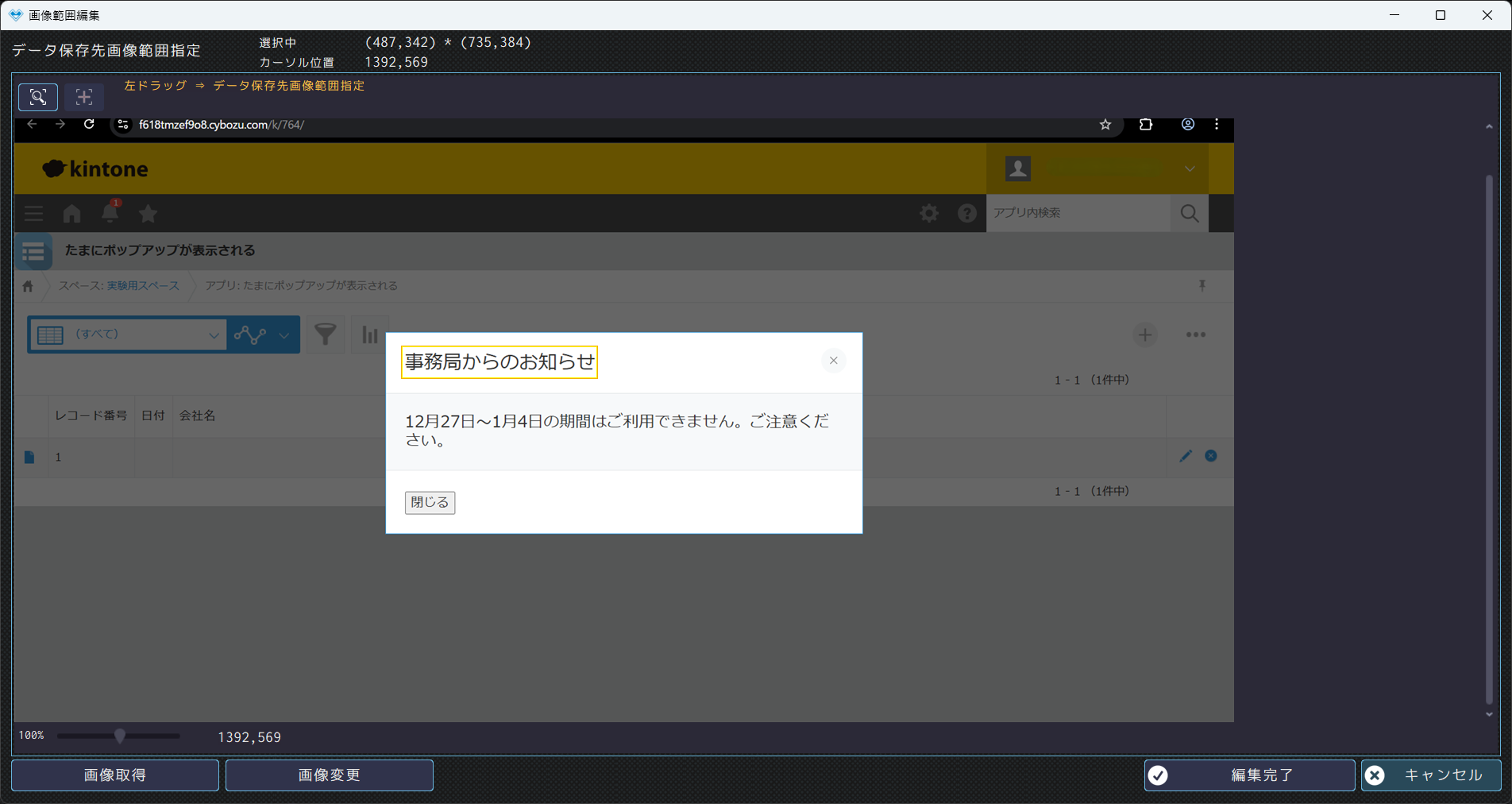 対象画面が表示されるときに、必ず表示される部分を画像範囲にしましょう。 - 「編集完了」ボタンをクリックします。