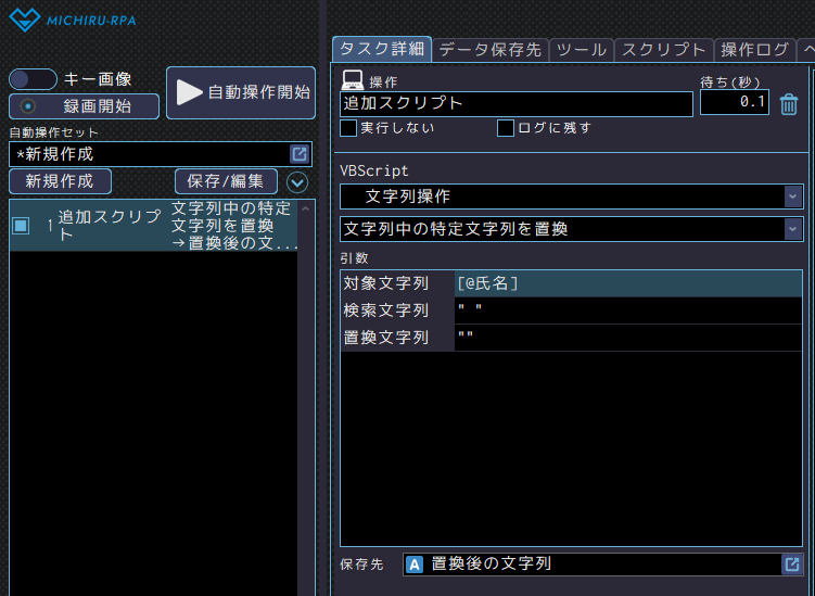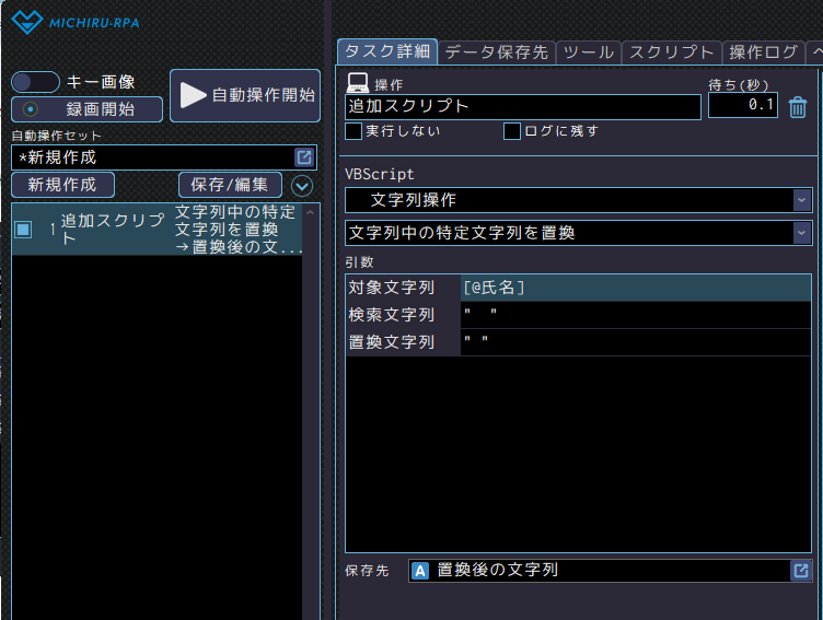 実行すると、対象文字列に半角スペースが含まれる場合には削除され、設定したデータ保存先に保存されます。