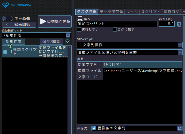 - 操作メニューの「関数/スクリプト」から「追加スクリプト」の操作を追加し、「文字列操作」の「変換ファイルを使い文字列を置換」を選択