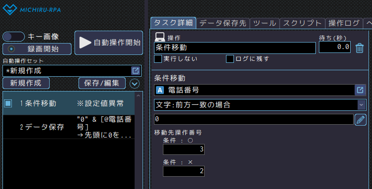 データ保存先に保存されている電話番号の先頭に0が付いているかどうかを判定して、その後の処理へ移動する設定をします。