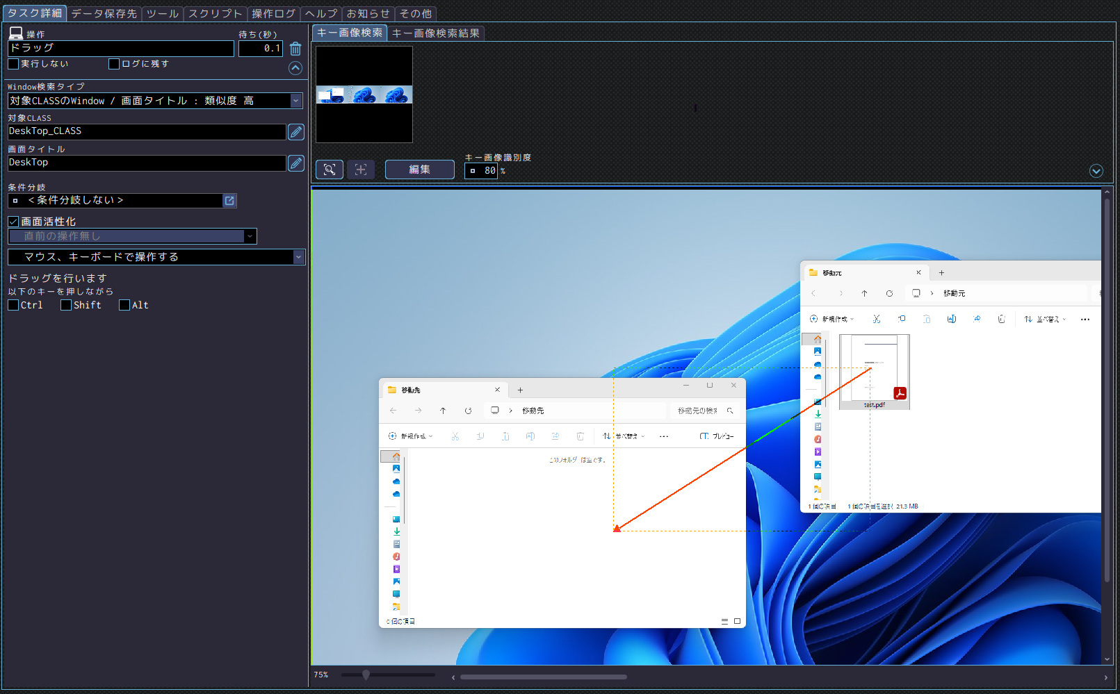 画像/エレメント取得ショートカットキーを押して画像を取得します。編集画面を開き、目印となる画像範囲(キー画像)を左ドラッグで、ドラッグしたい範囲を右ドラッグで指定します。