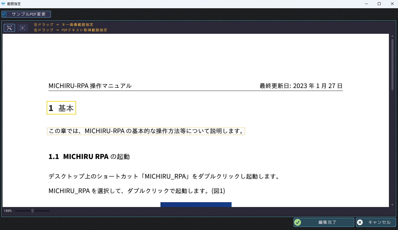 エレメント取得後に編集画面を開き、読み取りたい範囲を右ドラッグで指定します。
