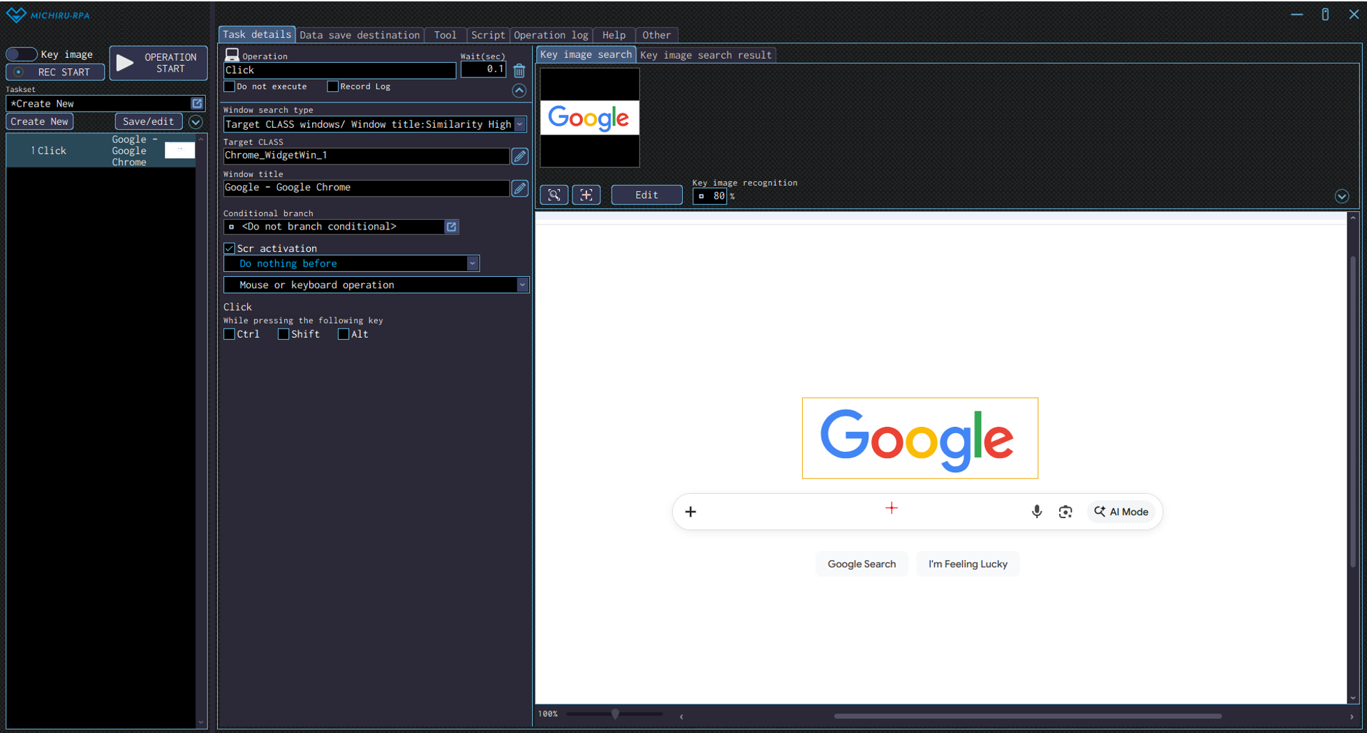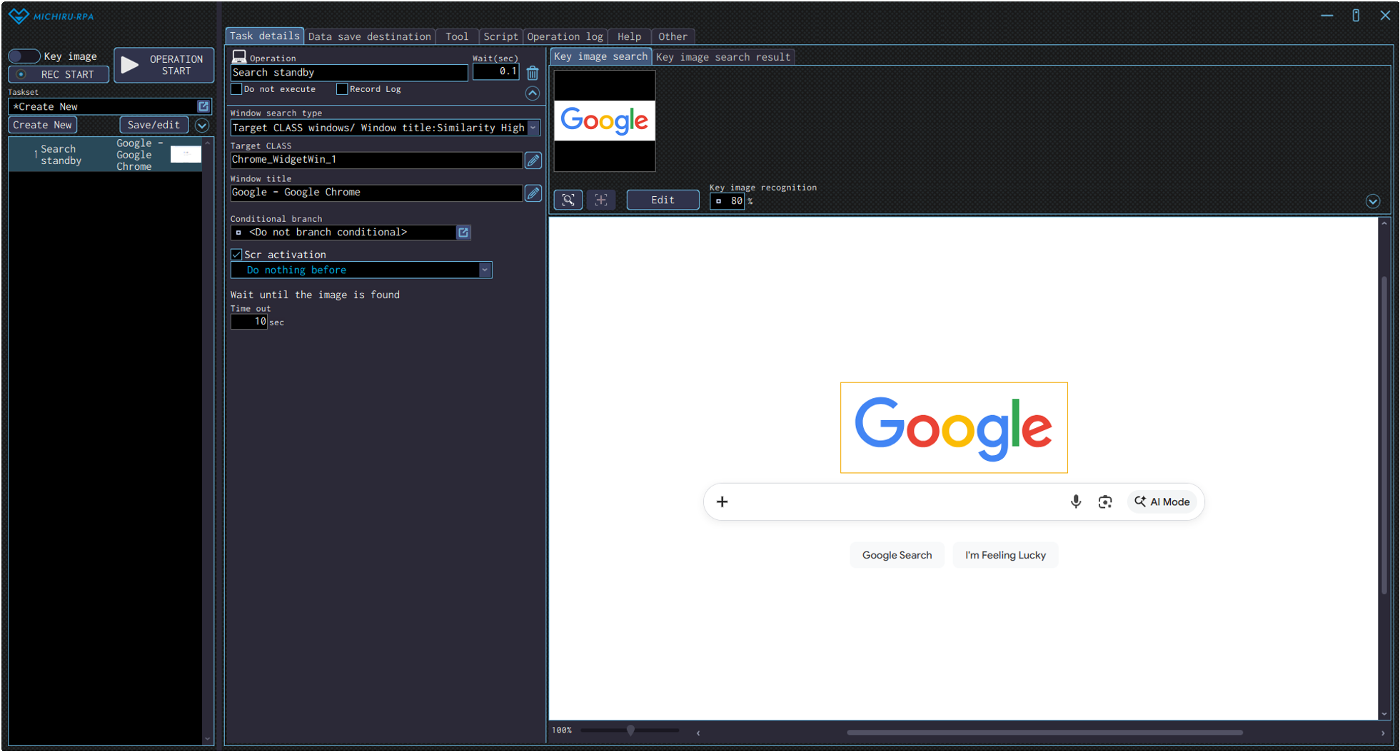 The example below shows the settings where the RPA look for the Google’s logo (in the orange frame), then click on the search field (red cross).