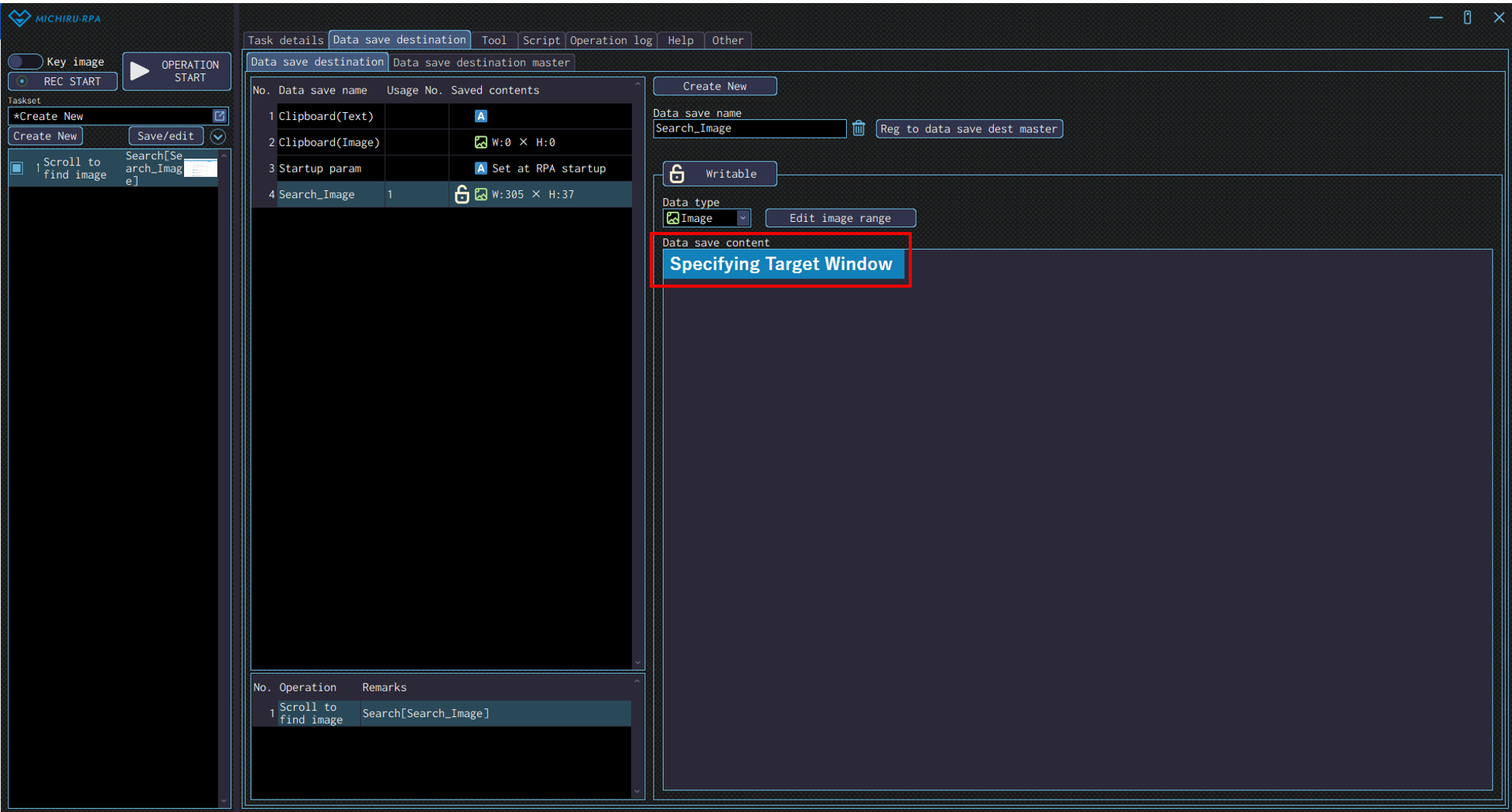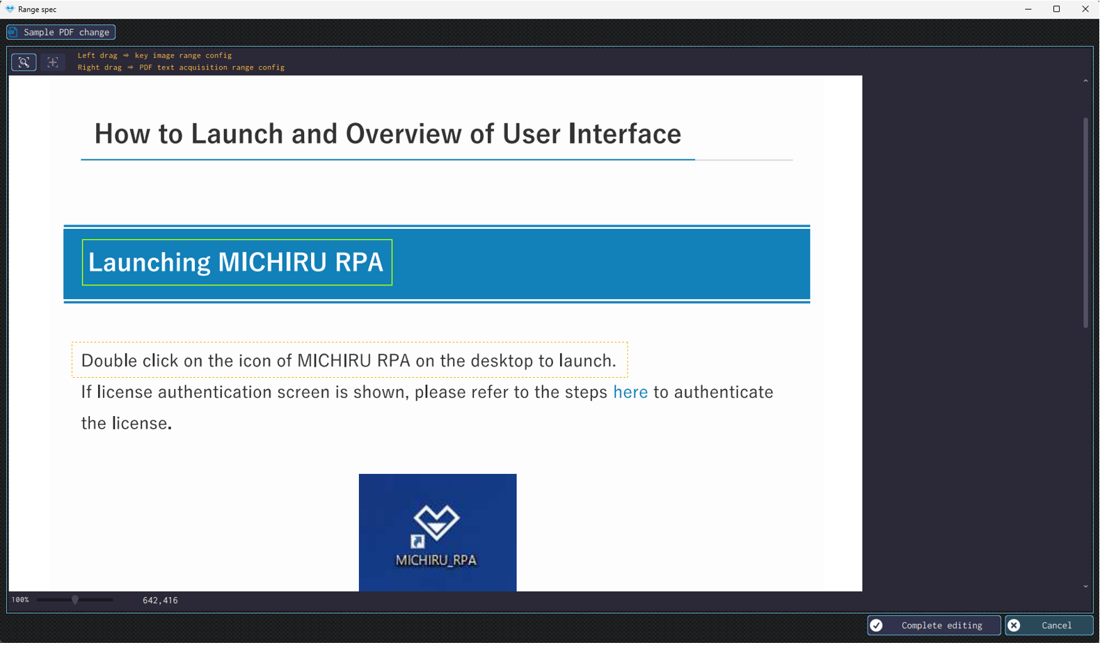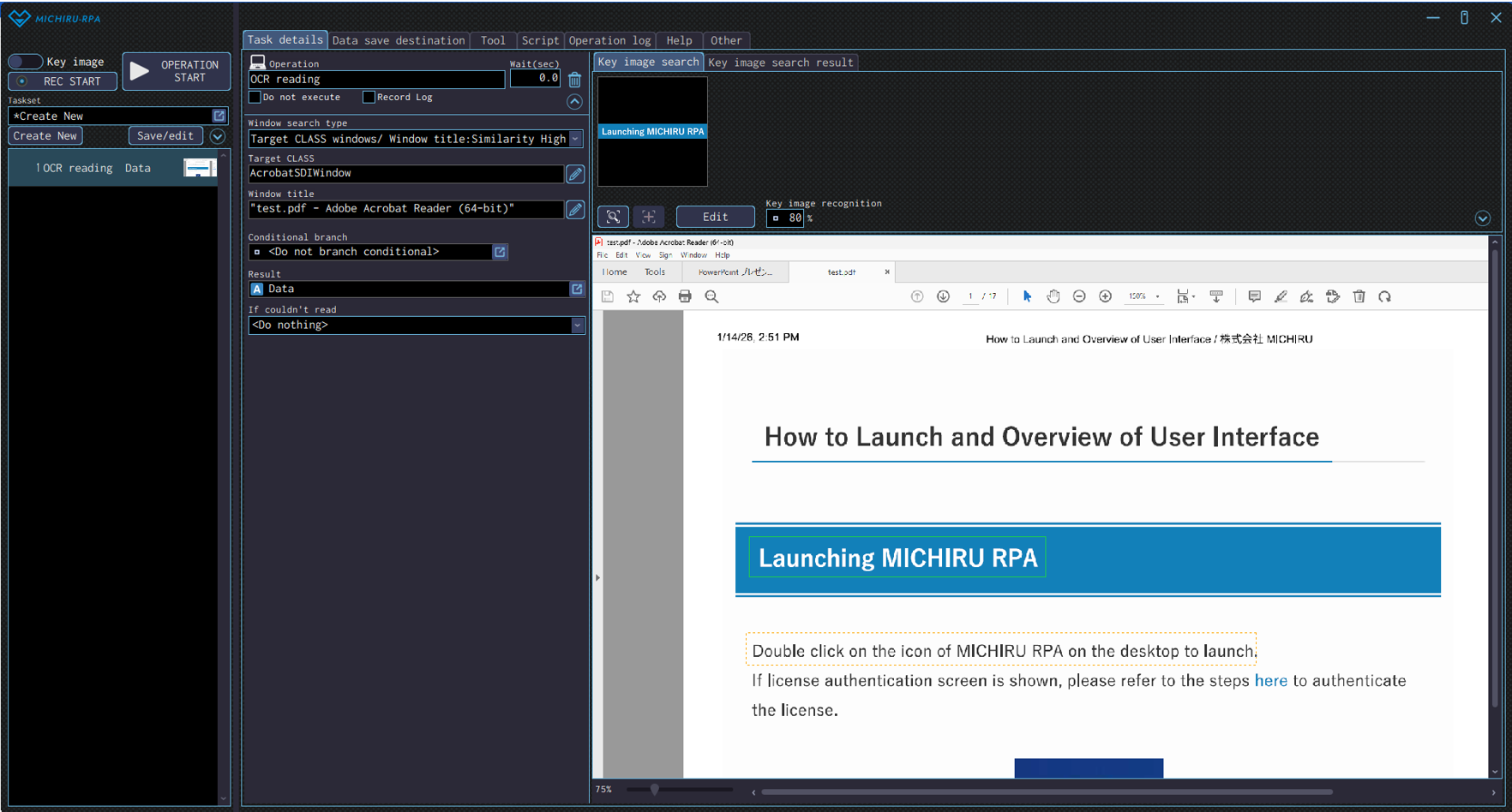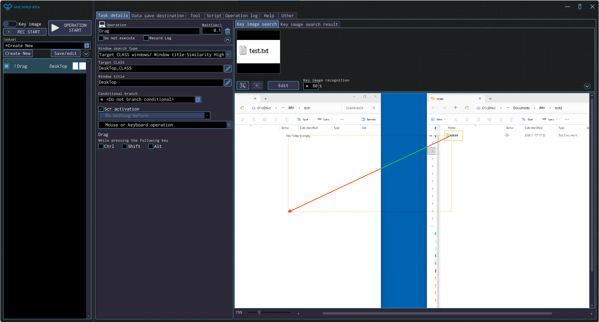 The image below shows the case where the RPA look for “Launching MICHIRU RPA” (in the orange frame), then drag on the text that is below the the key image (in the frame with dotte line).