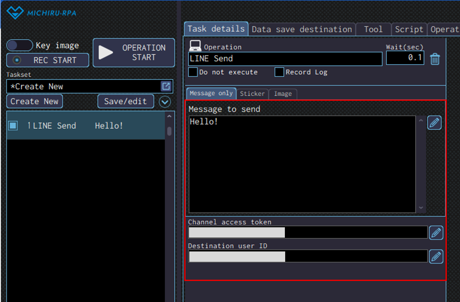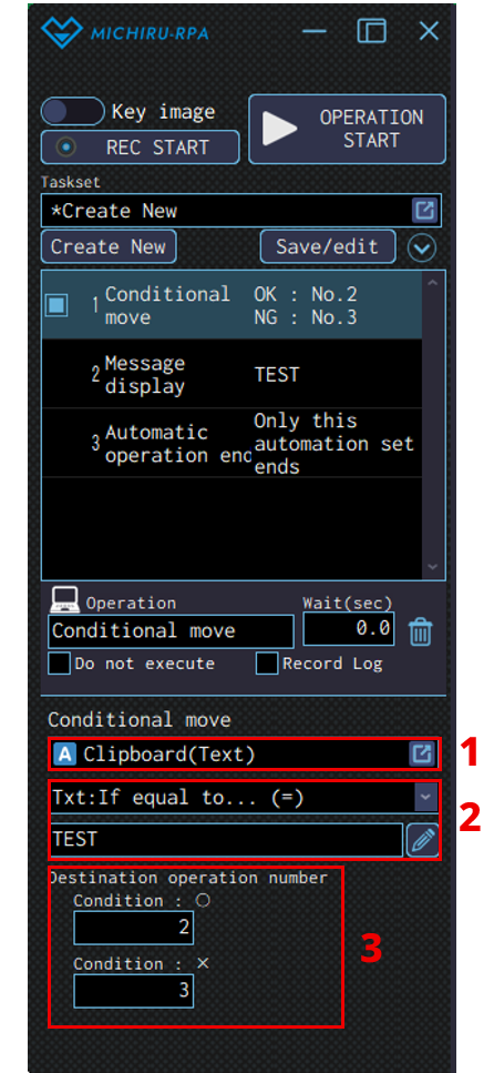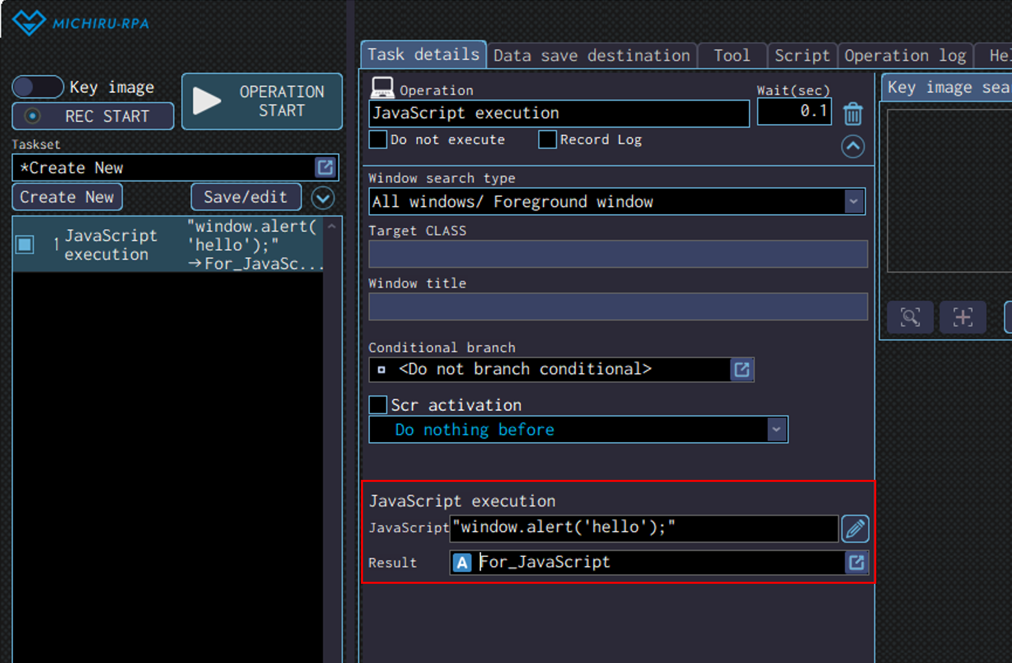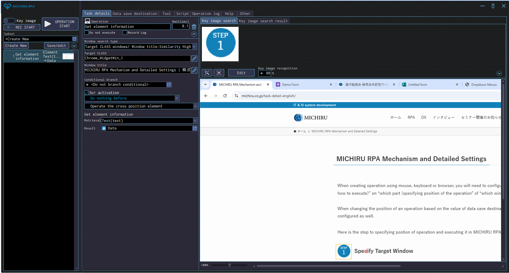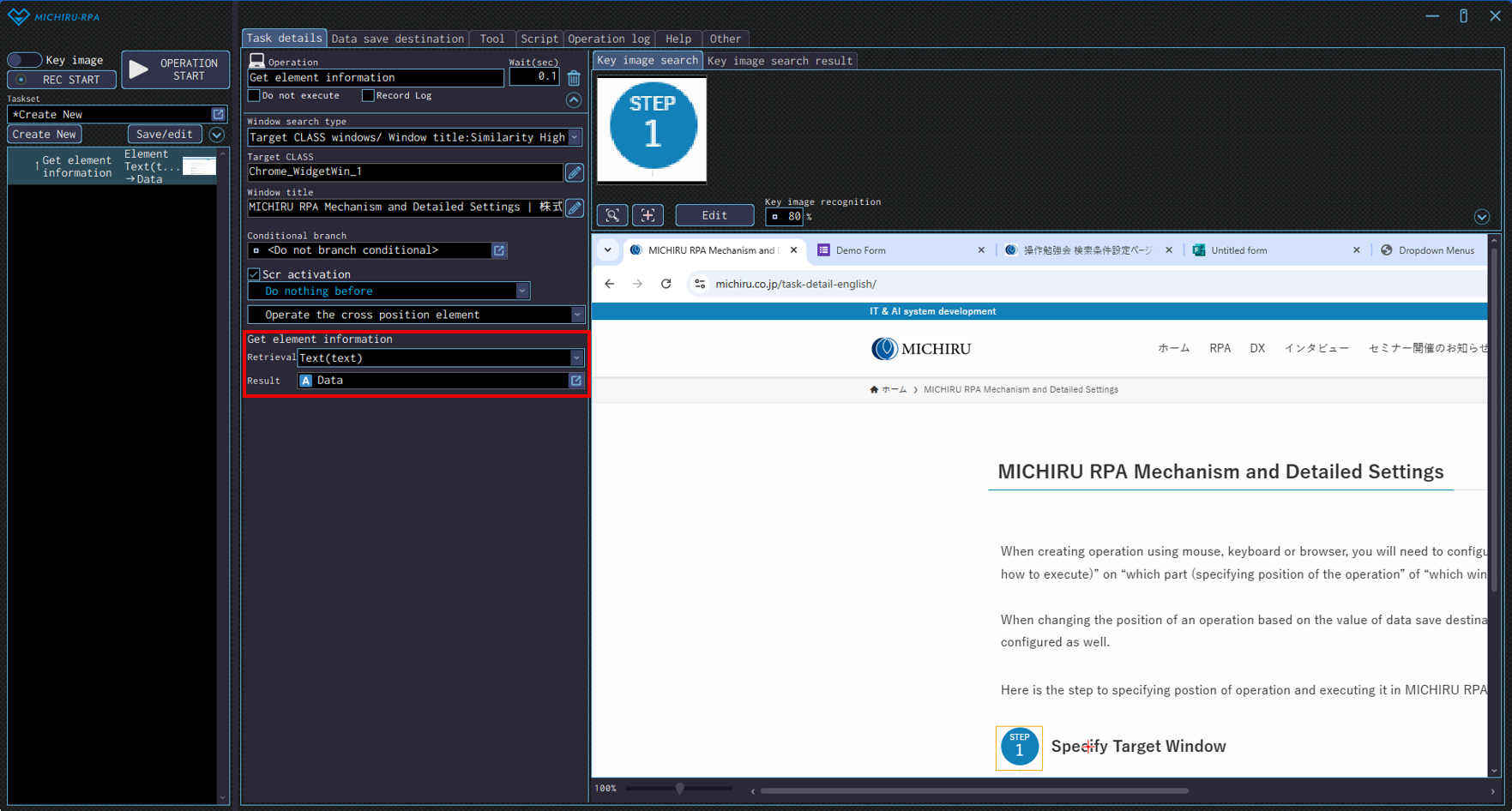 The image below shows the case where the RPA look for “Launching MICHIRU RPA” (in the orange frame), then drag on the text that is below the the key image (in the frame with dotte line).