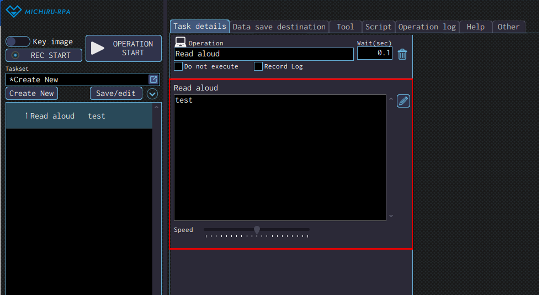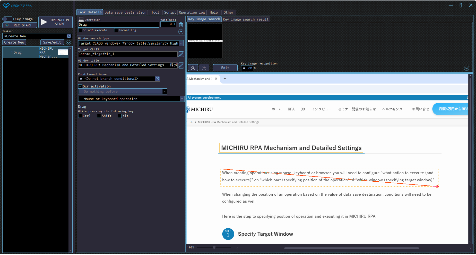 Open the “Edit” screen, specify the the area of the image you want to mark as key image by left mouse drag, and specify the area you want the RPA to drag over by right mouse drag.The example below shows the settings where the RPA look for the image of “ABOUT MICHIRU RPA” (in the orange frame), then drag on the area below (in the red frame with arrow).