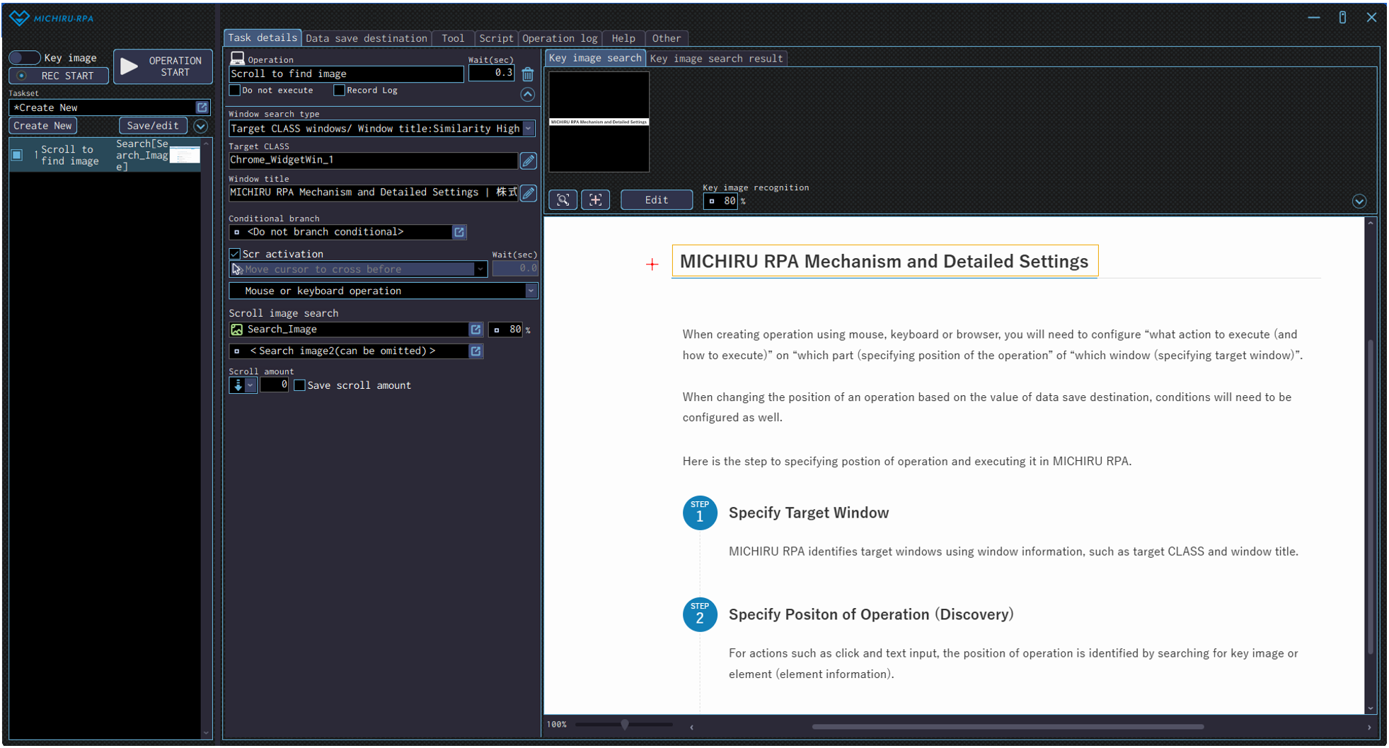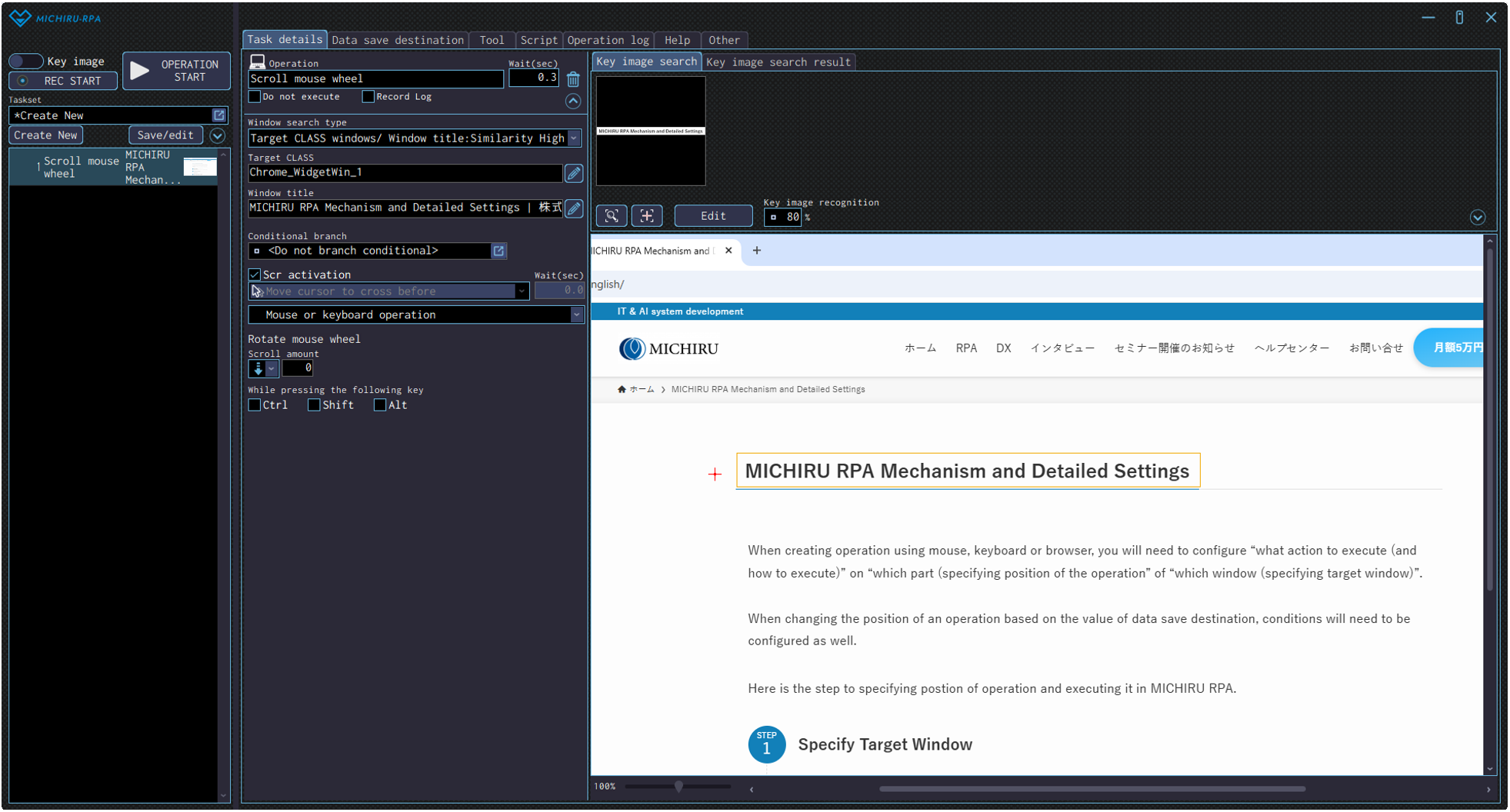 Open the”Edit” screen, and specify the area of the image you want to mark as key image by left mouse drag, then specify the position to do the mouse wheel scroll by right-clicking.The example below shows the settings where the RPA look for the image of “ABOUT MICHIRU RPA” (in the green frame), then do a mouse wheel scroll on the left (where the red cross is).
