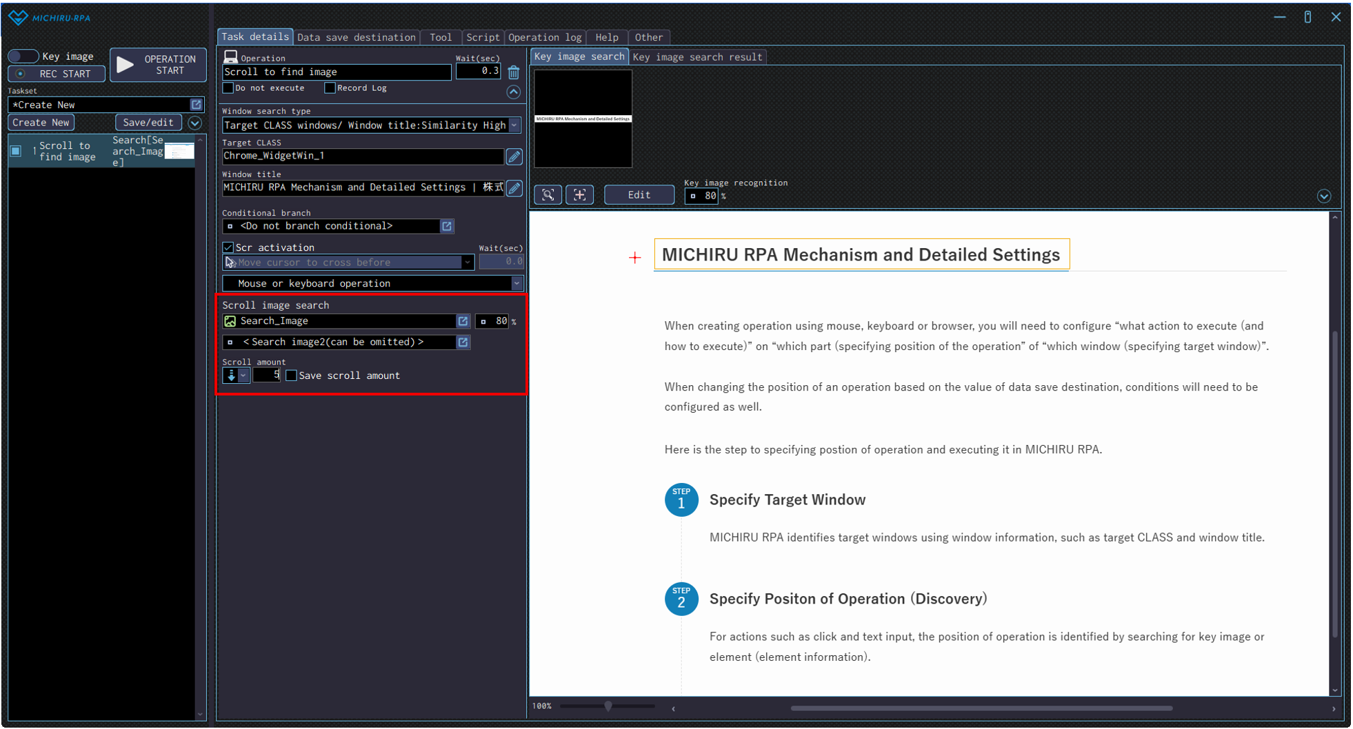 You can configure the direction and the amount of the scroll in the settings marked by the red frame in the image below. You can also make the RPA record the scroll amount needed to find the image to make it faster to run the operation next time, by checking on the “Save scroll amount” checkbox.