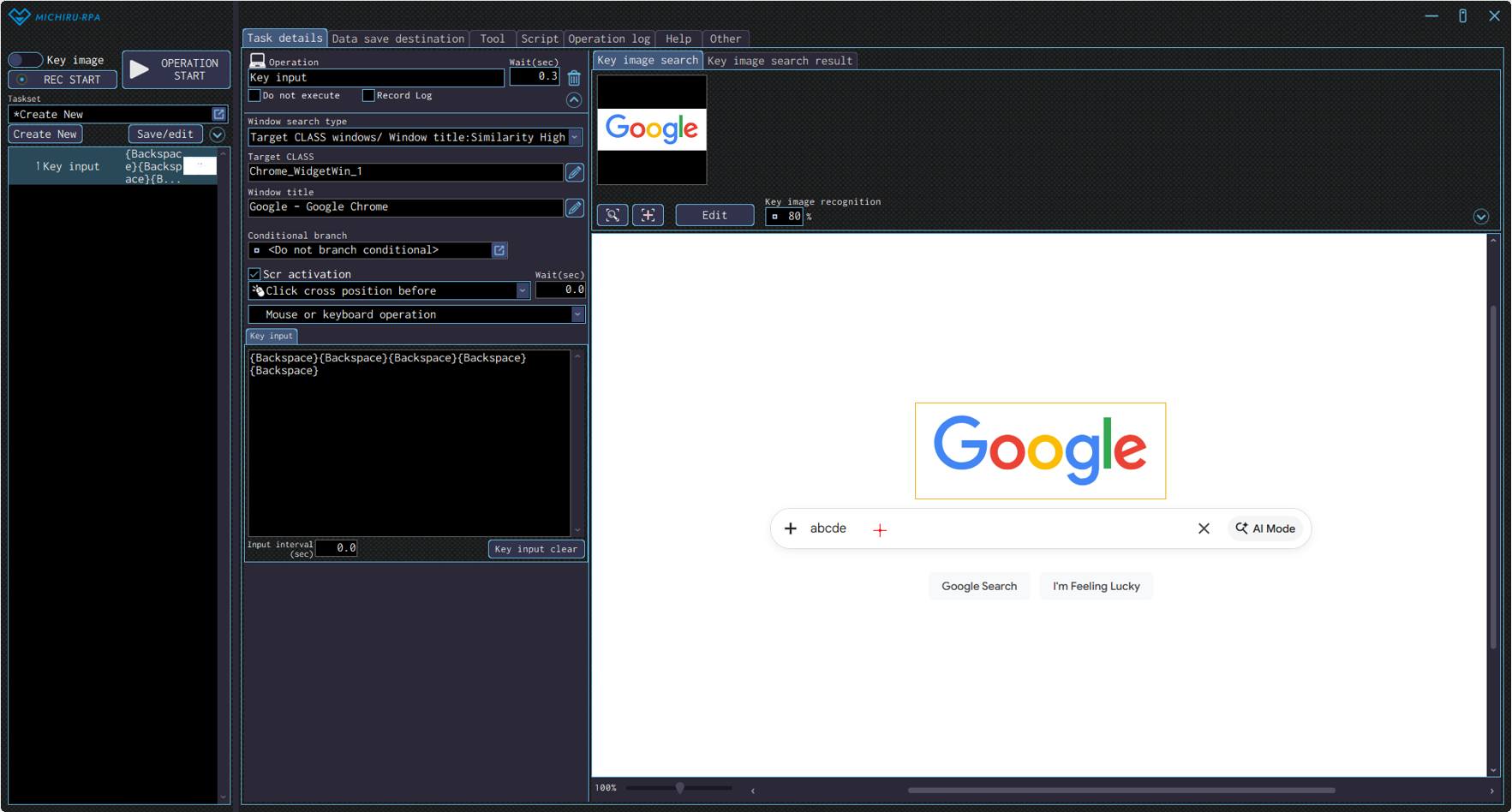 You can change the input position by right-clicking on the new position (red cross).The example below shows the settings where the RPA look for the Google’s logo (in the orange frame), click on the search field (red cross), then input Backspace key 5 times.
