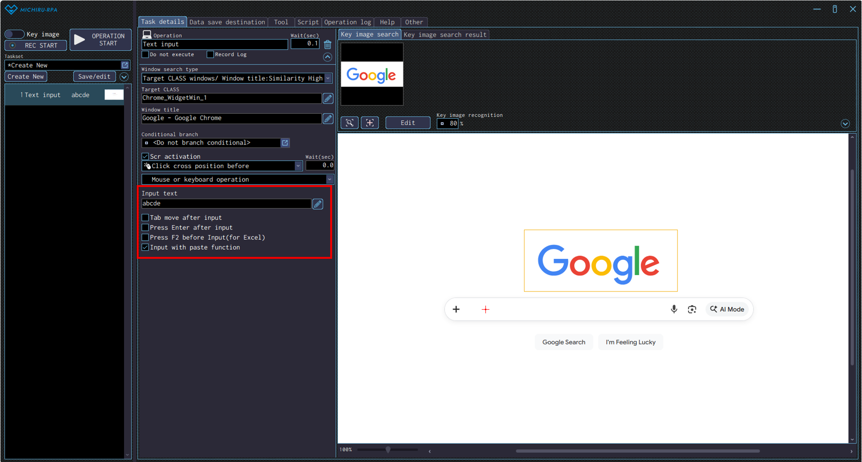 You can change the input position by right-clicking on the new position (red cross).The example below shows the settings where the RPA look for the Google’s logo (in the orange frame), click on the search field (red cross), then input “abcde” into the field.