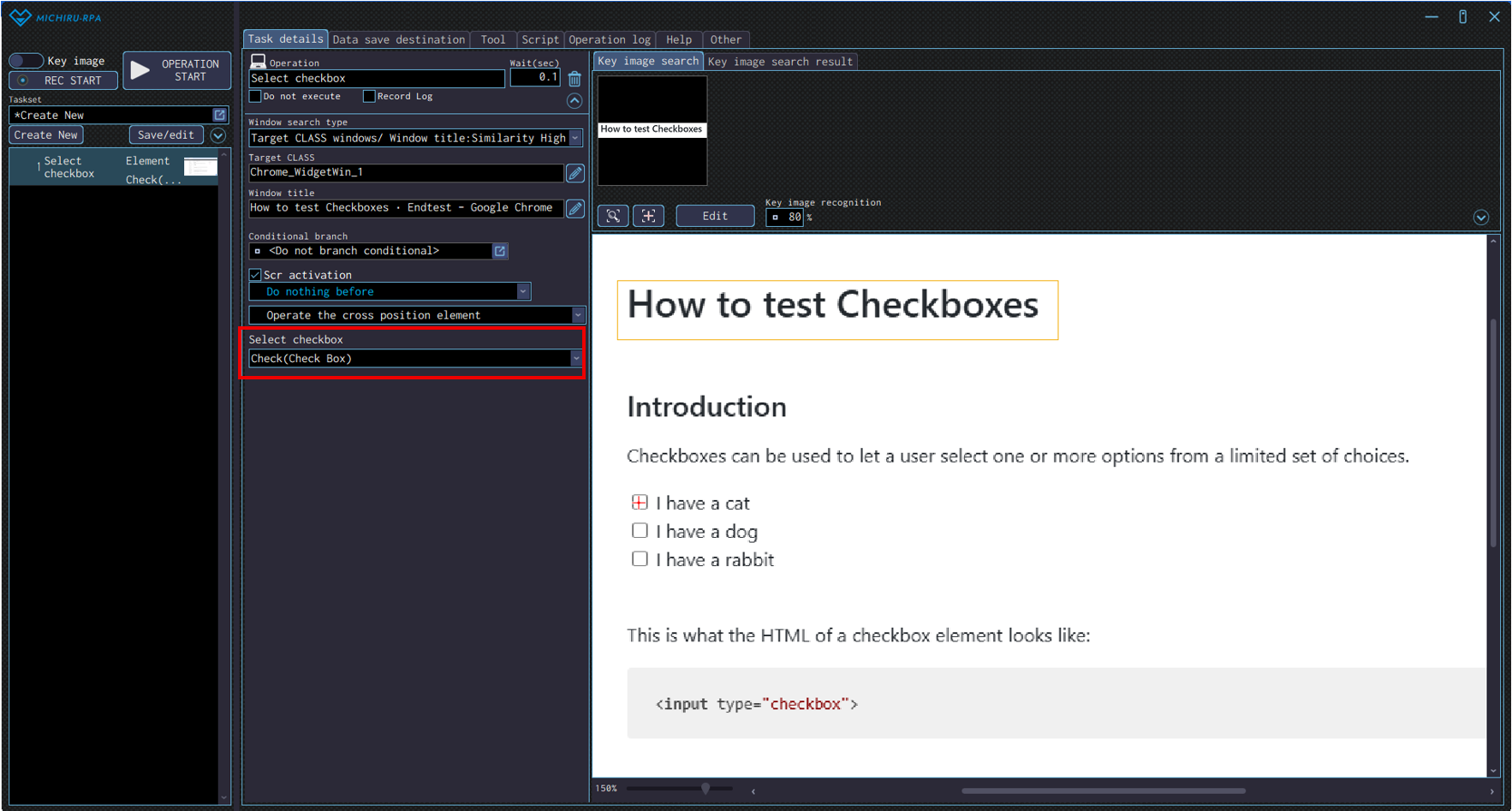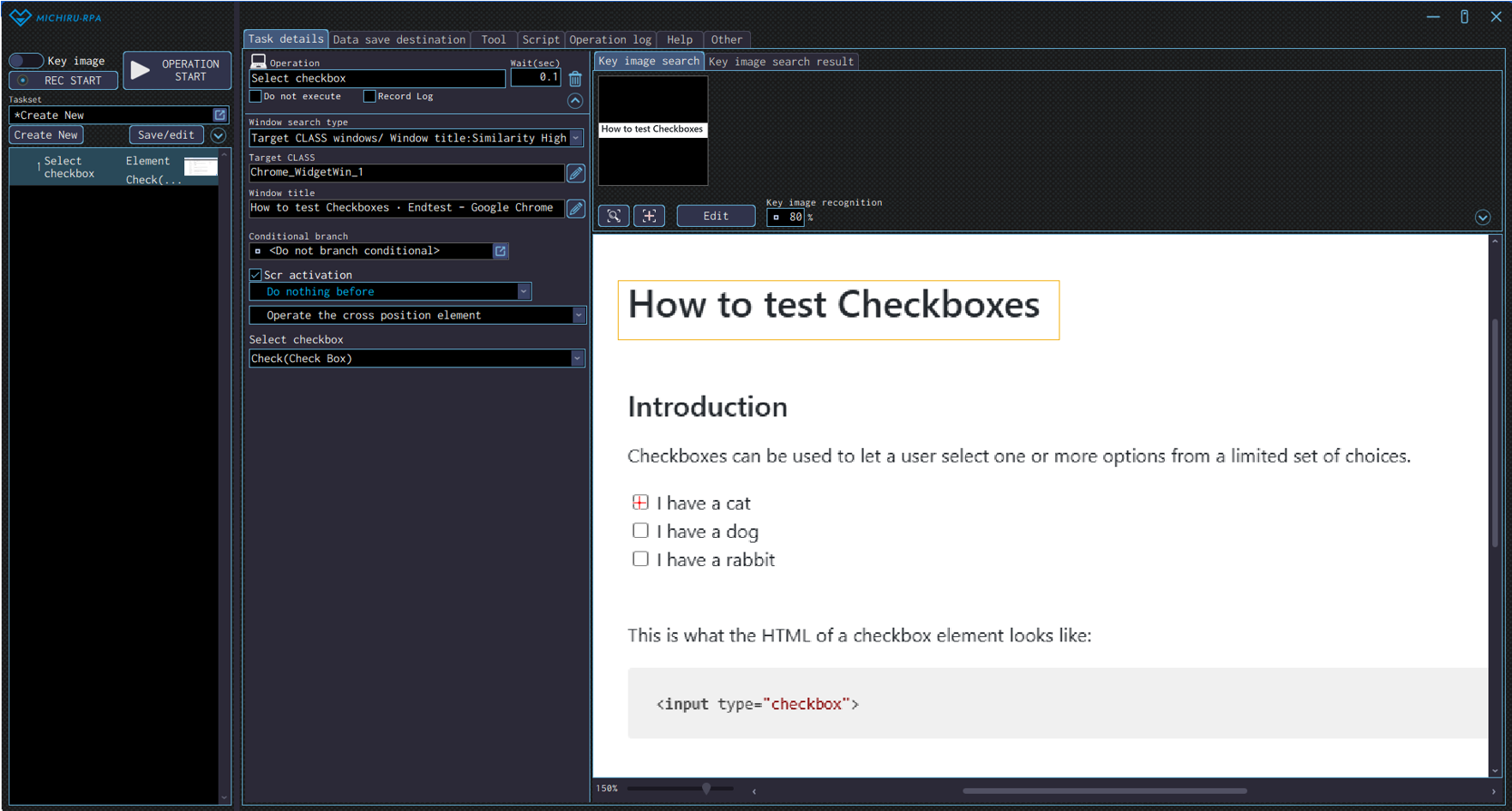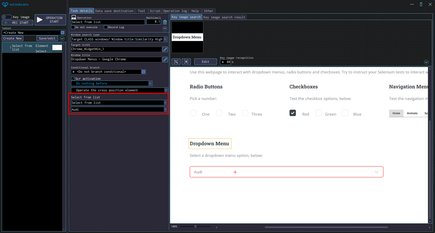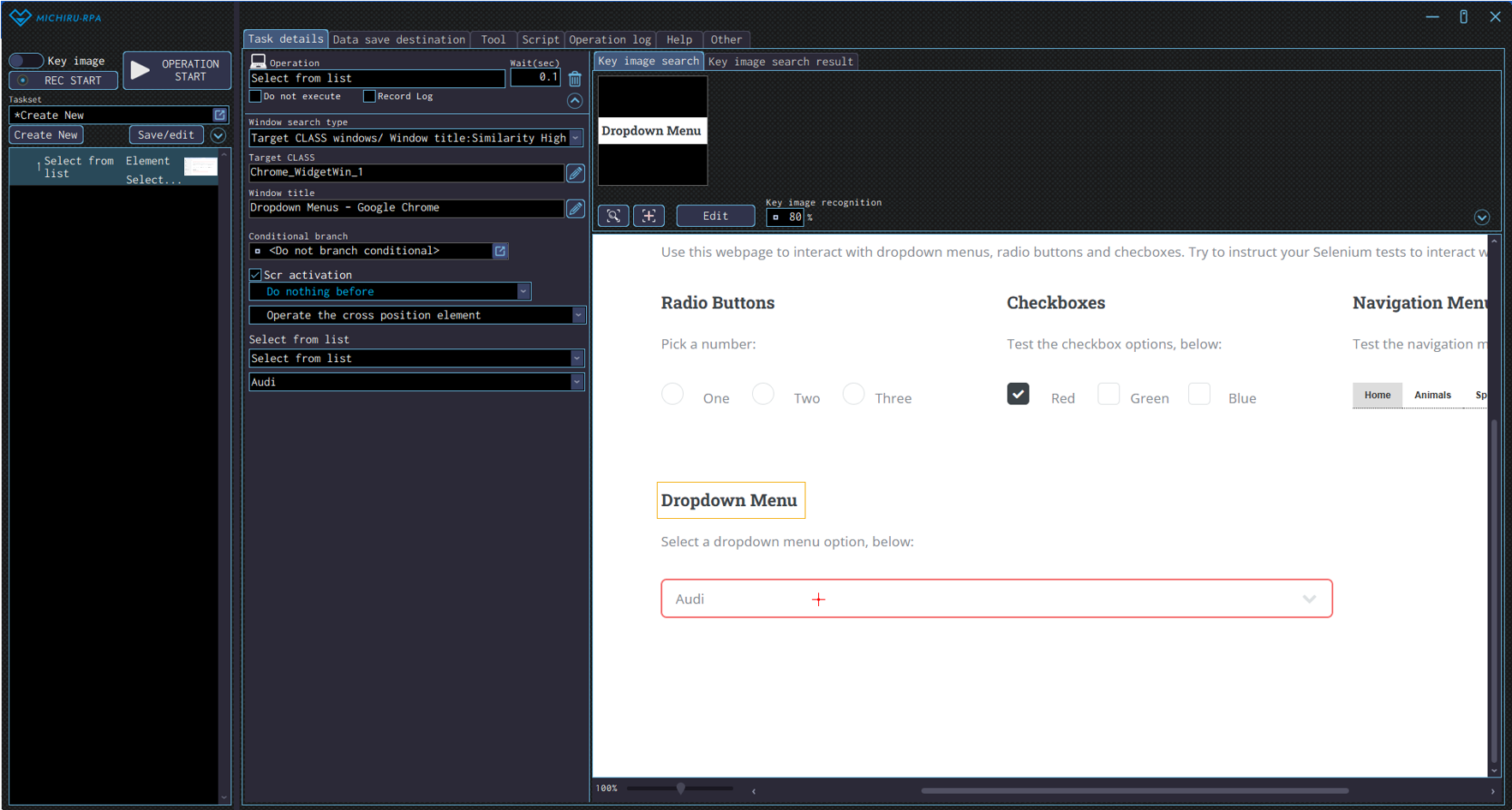 Move the cursor to the position you want to click, press the shortcut key to capture the image / element. If the operation that appears is not automatically set to “Click”, change the operation type in the operation box to “Click” in the “Mouse operation” menu. You can also set to operation to “Click” in the “Mouse operation” from the beginning, by moving the cursor to your target element and right-clicking to display the operation menu.