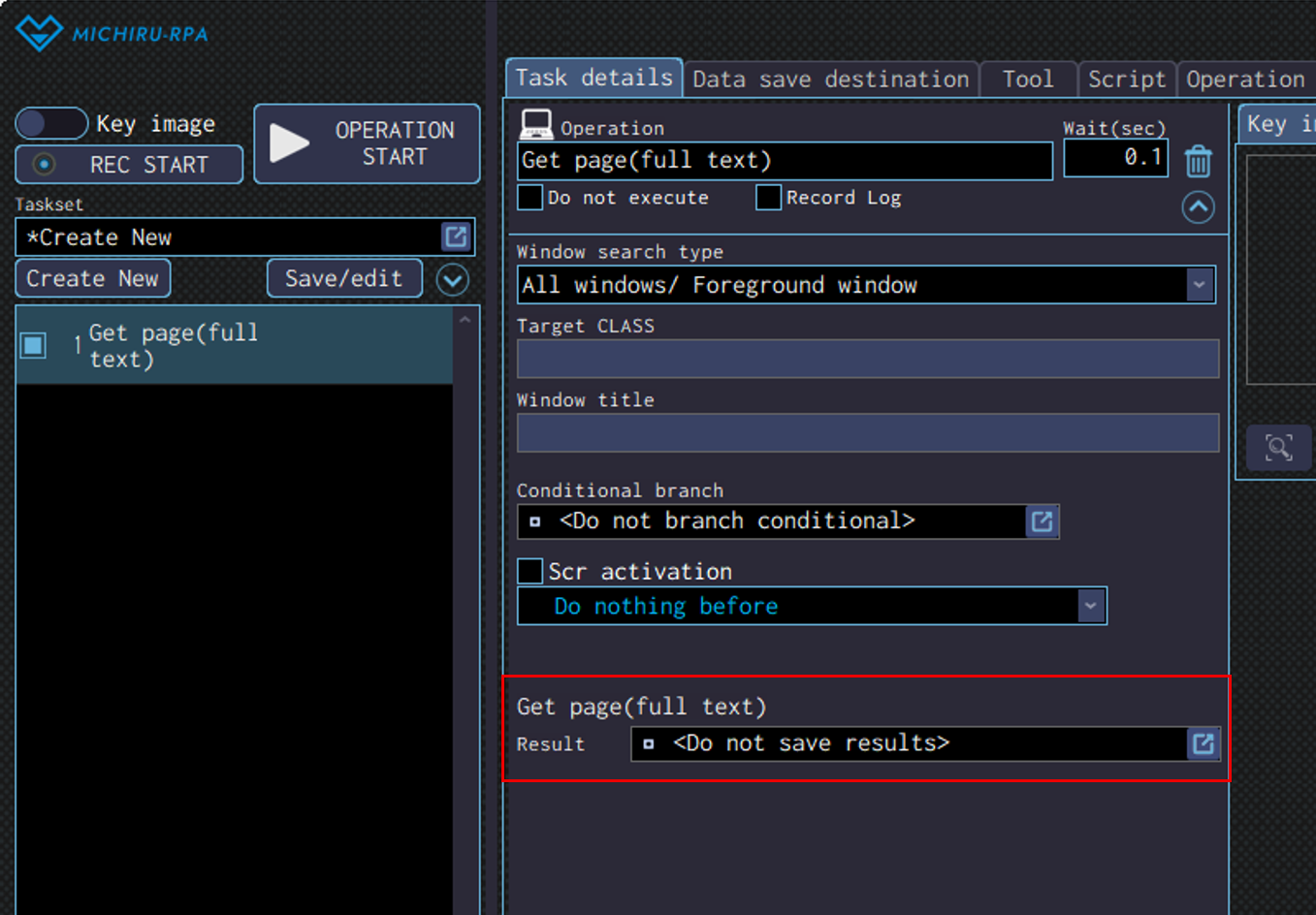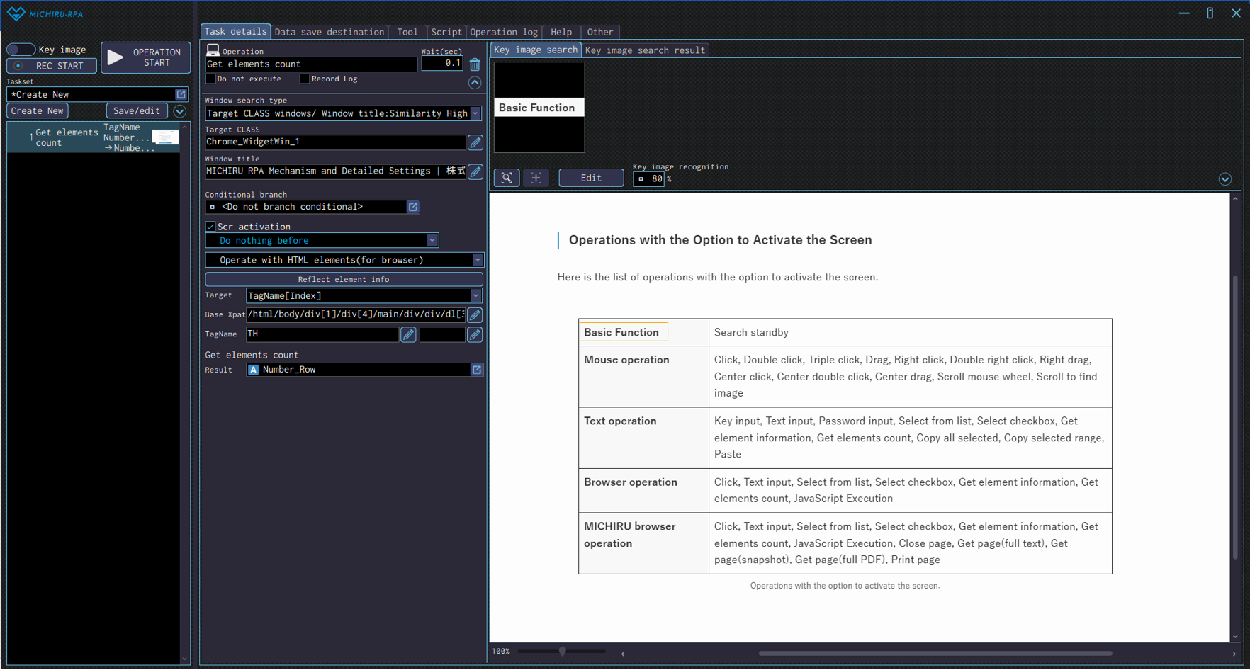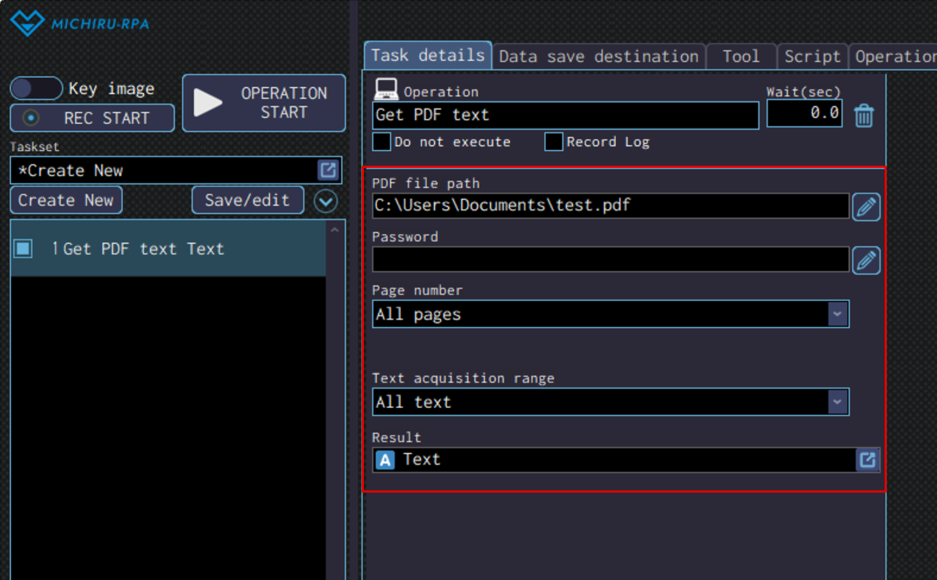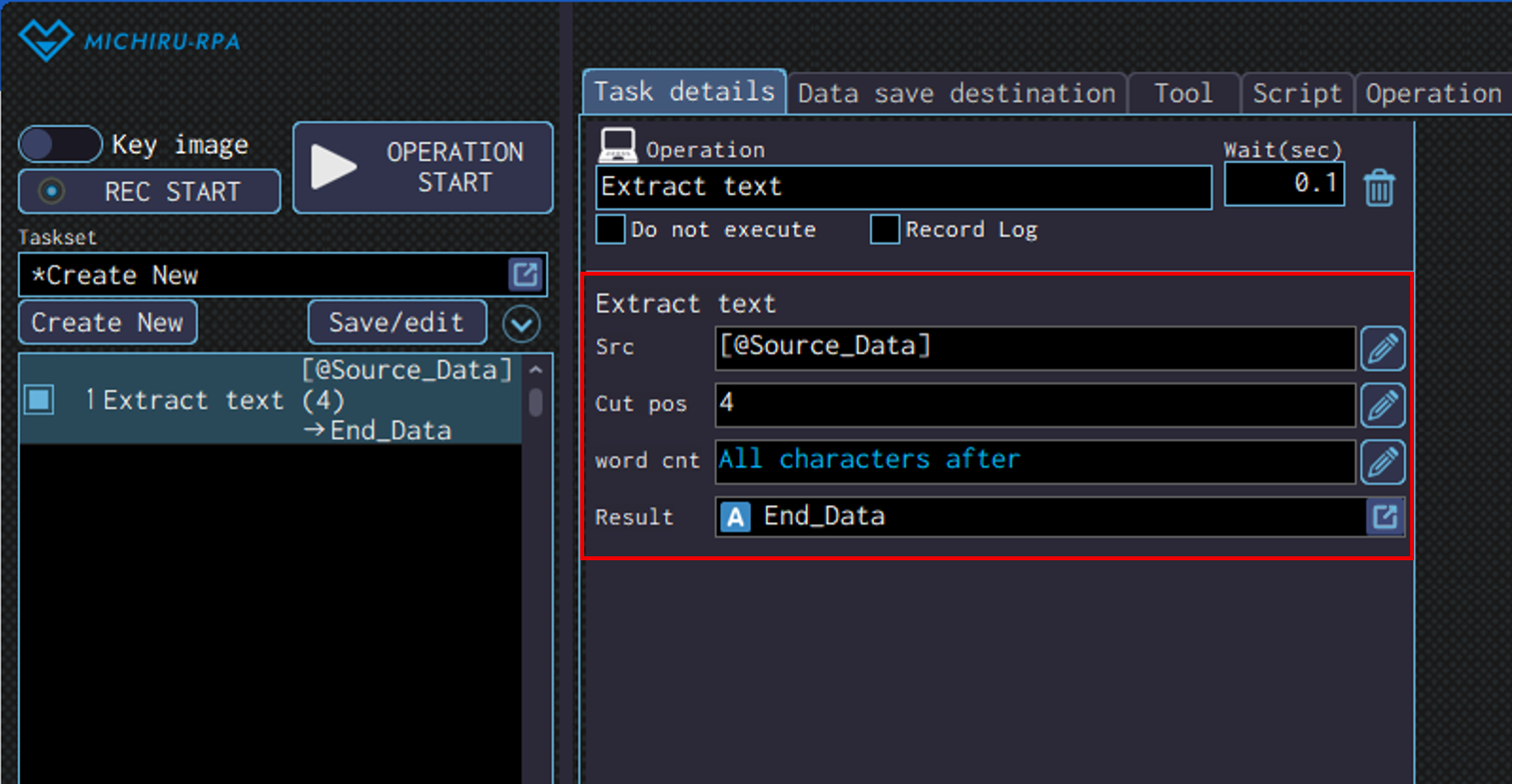 Detailed settings for each operation are to be done in the extension screen. For more information regarding commons settings across all operations, such as various settings in the targeted screen operation, how to specify points of operations, please refer to ‘MICHIRU RPA Mechanism and Detailed Settings‘.