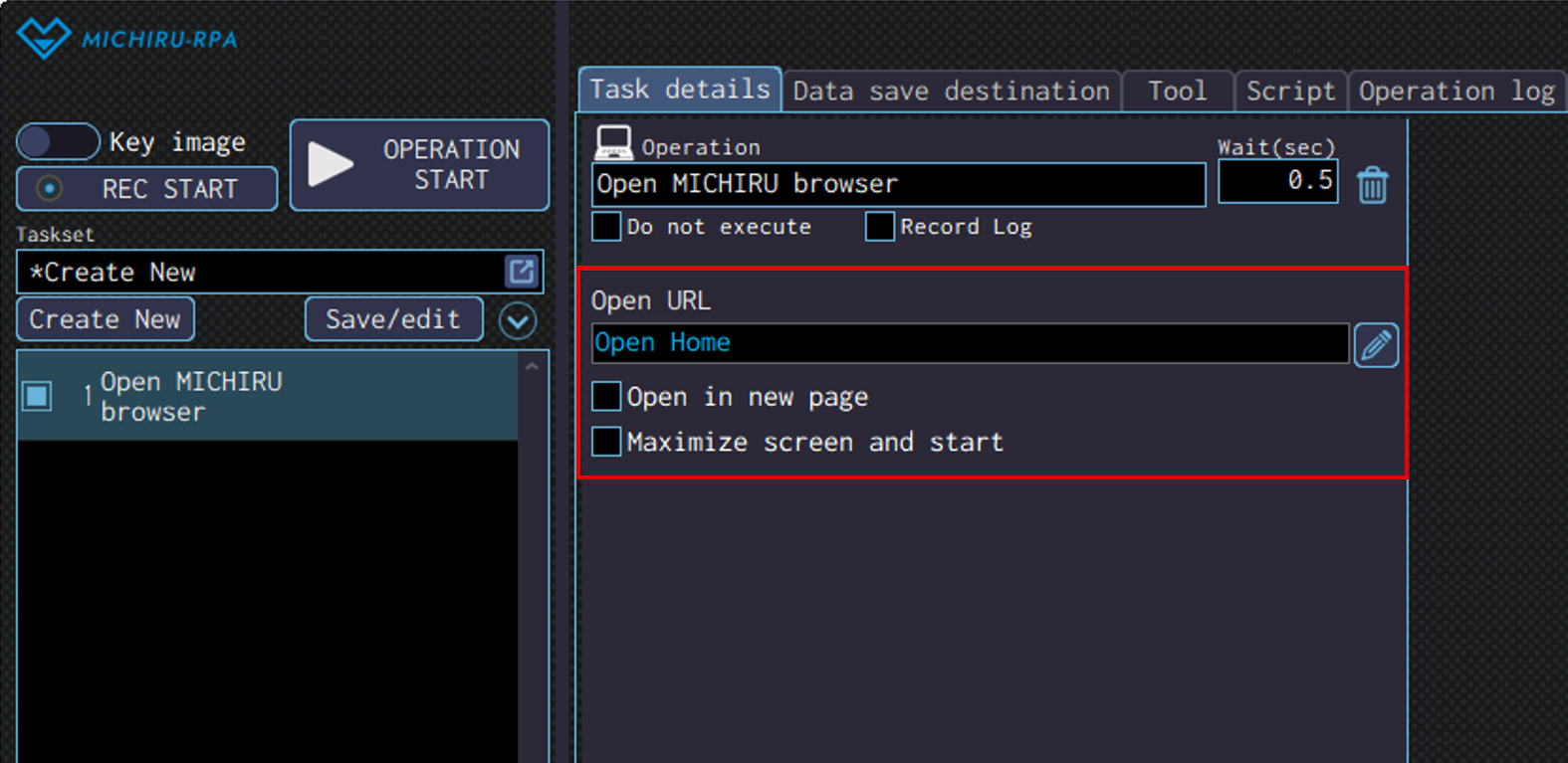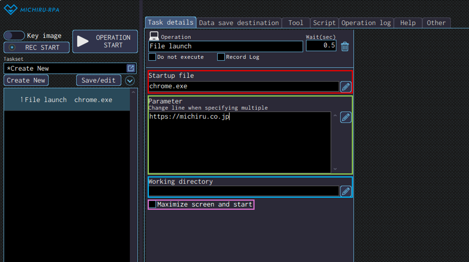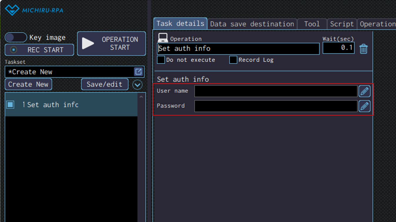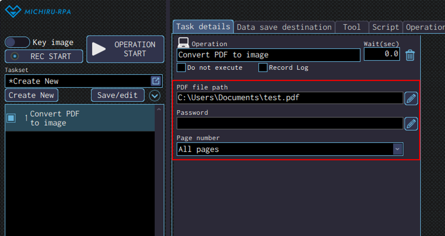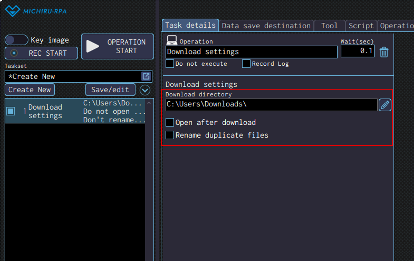 Detailed settings for each operation are to be done in the extension screen. For more information regarding commons settings across all operations, such as various settings in the targeted screen operation, how to specify points of operations, please refer to ‘MICHIRU RPA Mechanism and Detailed Settings‘.