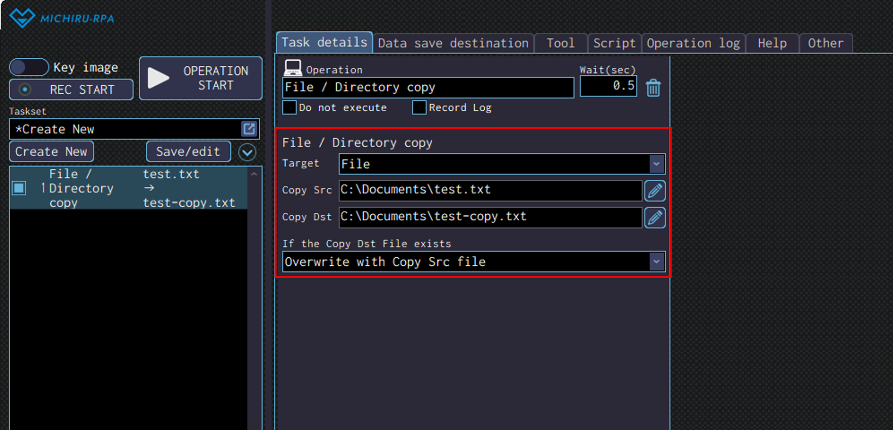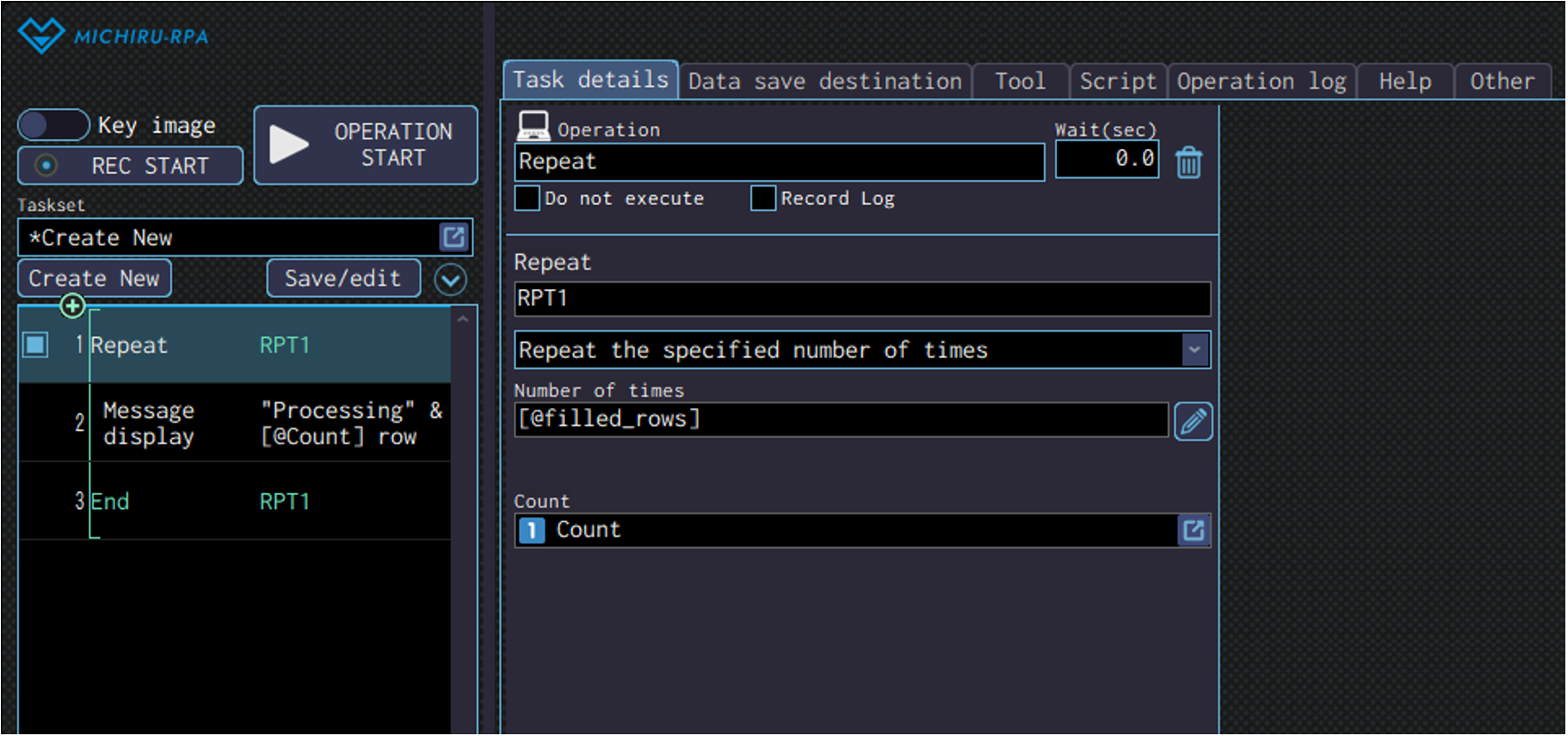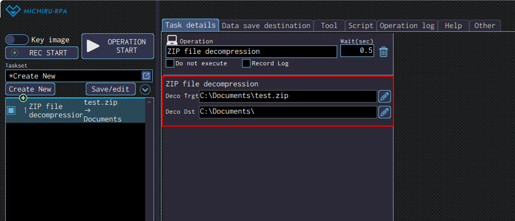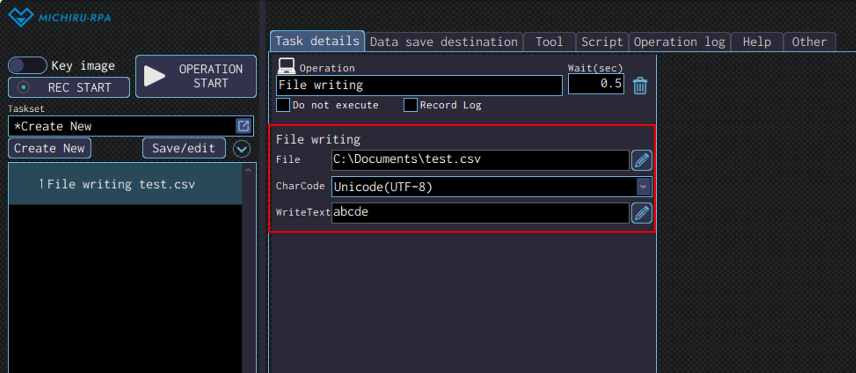 Detailed settings for each operation are to be done in the extension screen. For more information regarding commons settings across all operations, such as various settings in the targeted screen operation, how to specify points of operations, please refer to ‘MICHIRU RPA Mechanism and Detailed Settings‘.