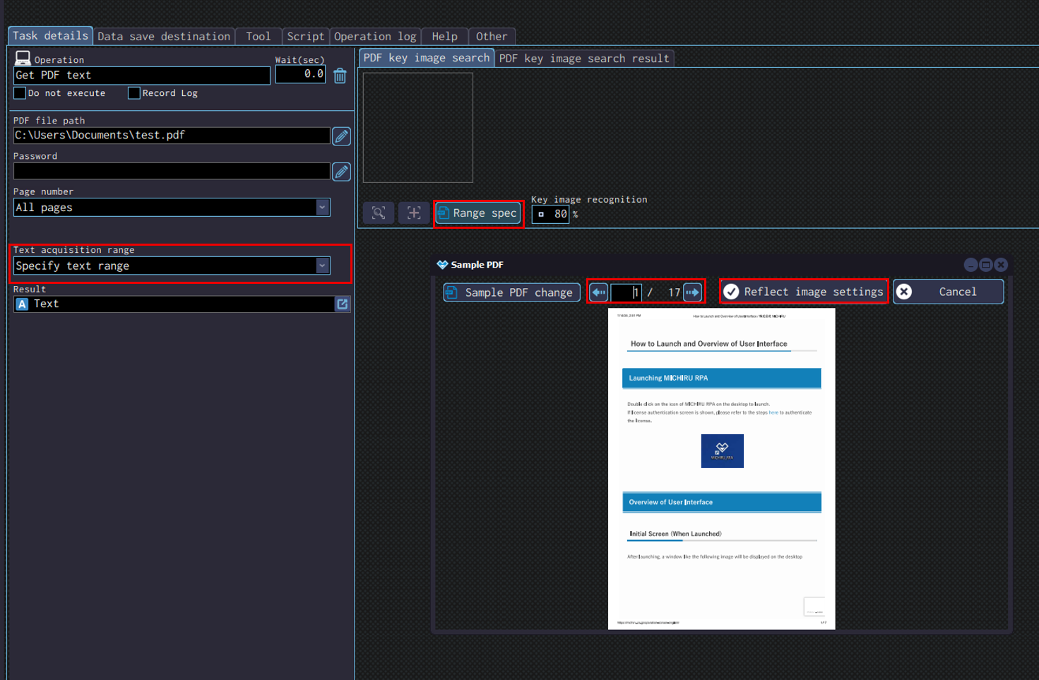 Press the shortcut key to capture the image / element. Open the “Edit” screen, specify the the area of the image you want to mark as key image by left mouse drag, and specify the area you want the OCR to read by right mouse drag.