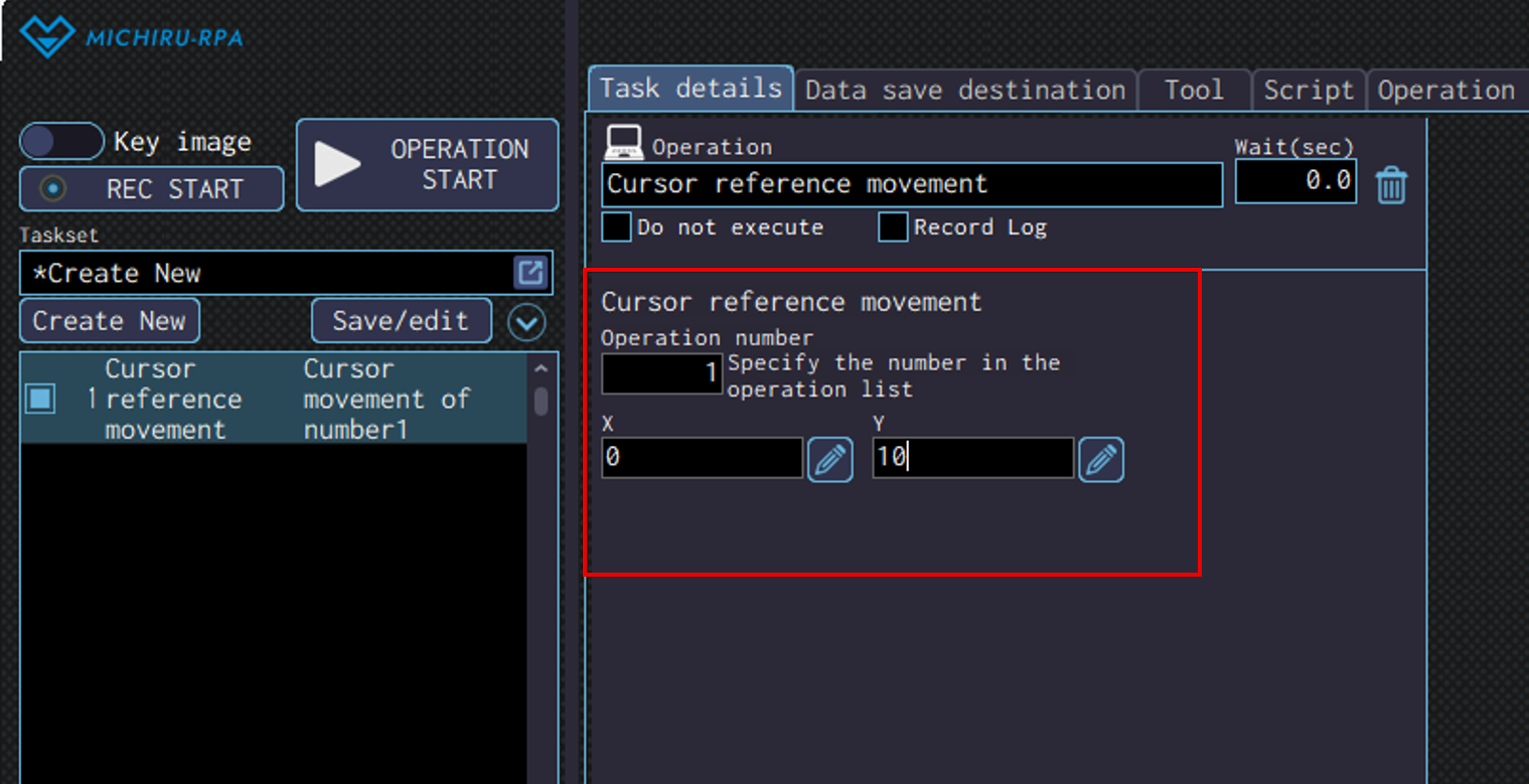 Specify the number of the operation in the “Operation number” field. Specify the amount of movement hoizontally and vertically in the “X” and “Y” field.