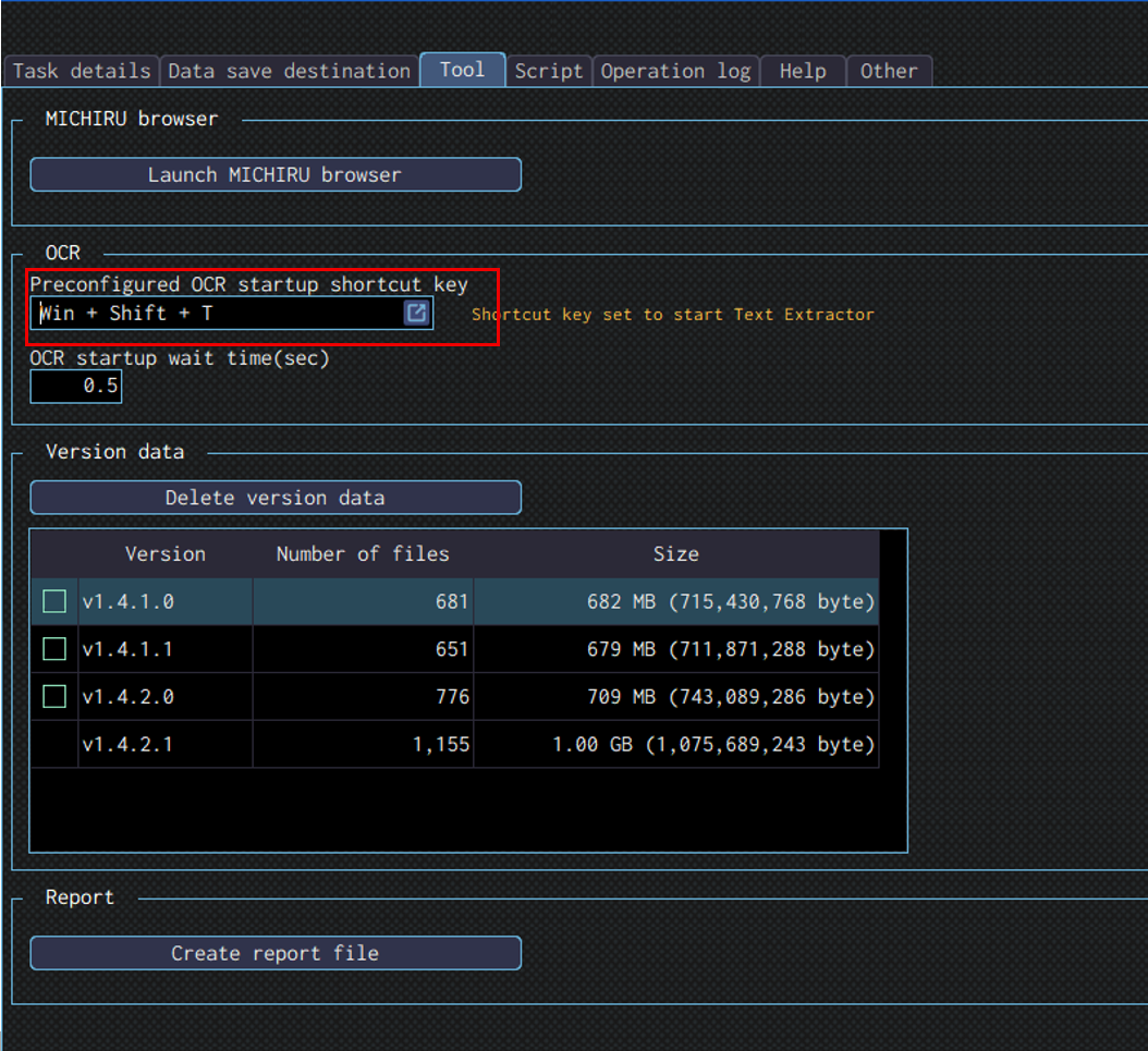 The default shortcut key is set to “Win + Shift + T”. If you want to change the shortcut key for this, make sure to make the same change to the “Preconfigured OCR startup shortcut key” in the “Tool” tab in MICHIRU RPA as well.