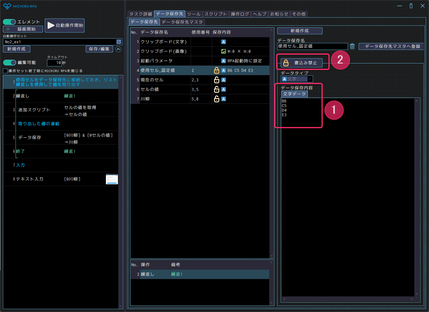 あらかじめ、使用するセルの値をデータ保存先に格納しておきます。なお、データ保存先を「書き込み禁止」に設定しておくことで、誤操作による内容の書き換えを防止できます(任意)。