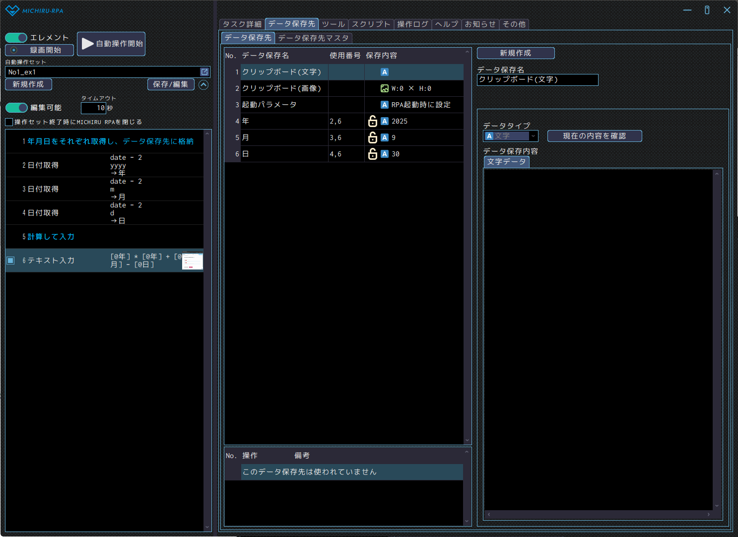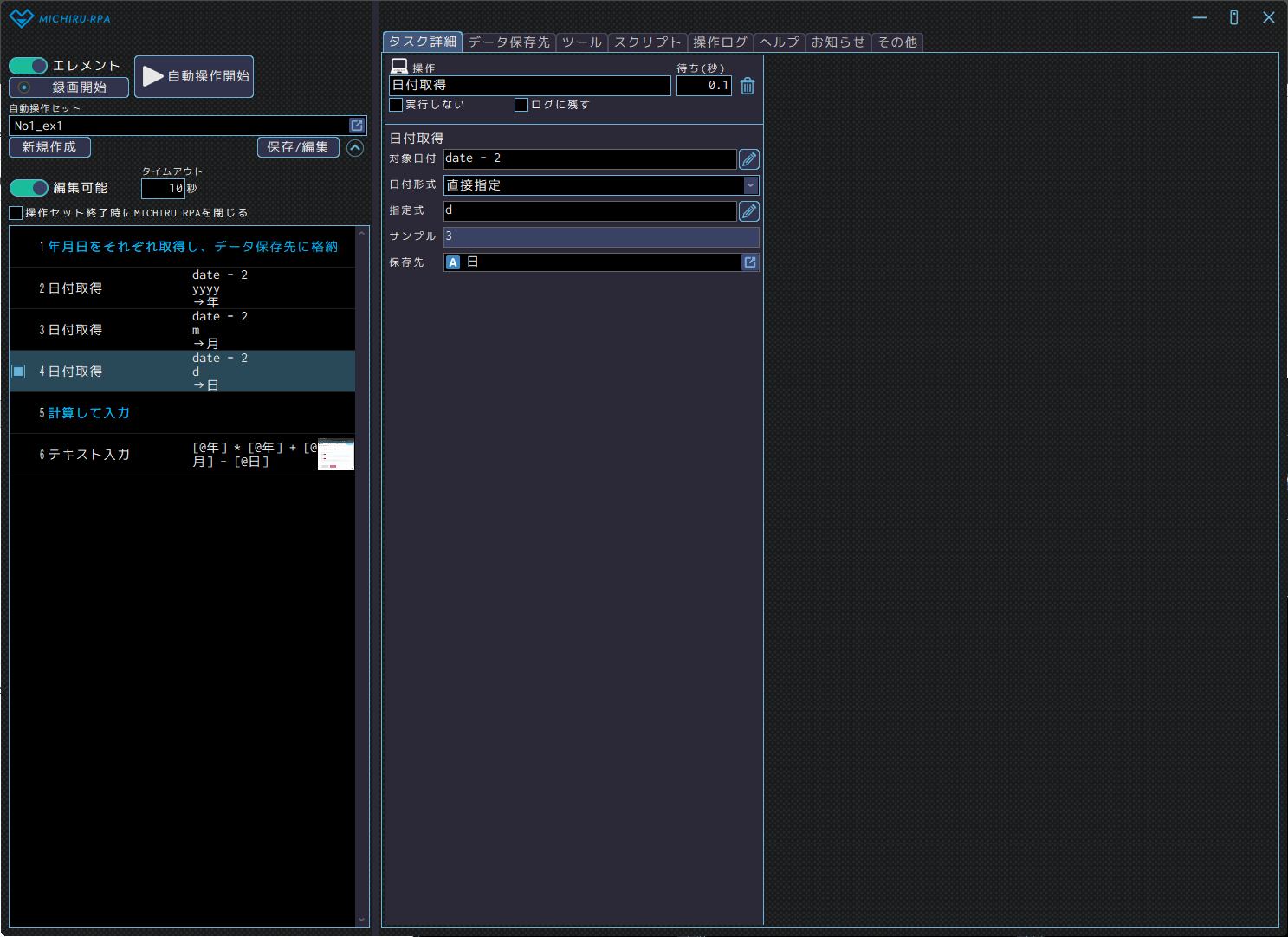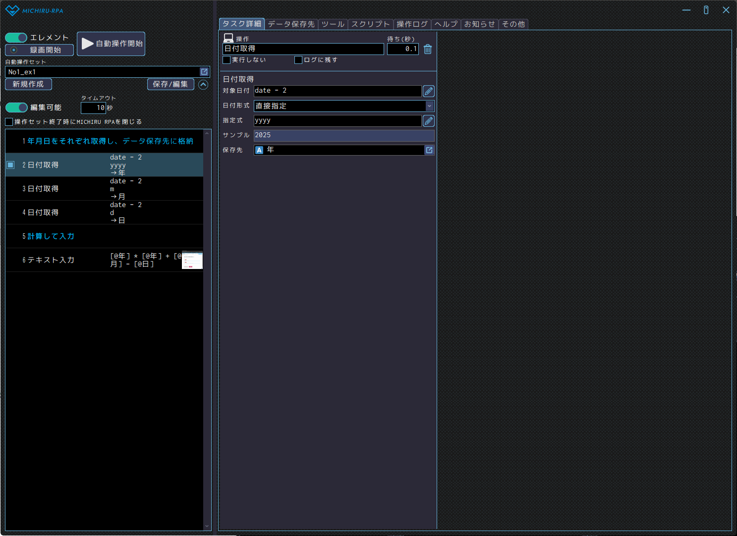 年月日の値をそれぞれ「日付取得」の操作を用いて取得します。日付形式を「直接指定」、指定式を「yyyy」「m」「d」とし、データ保存先に格納します。
