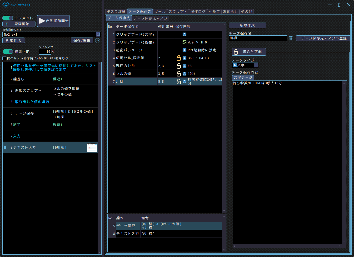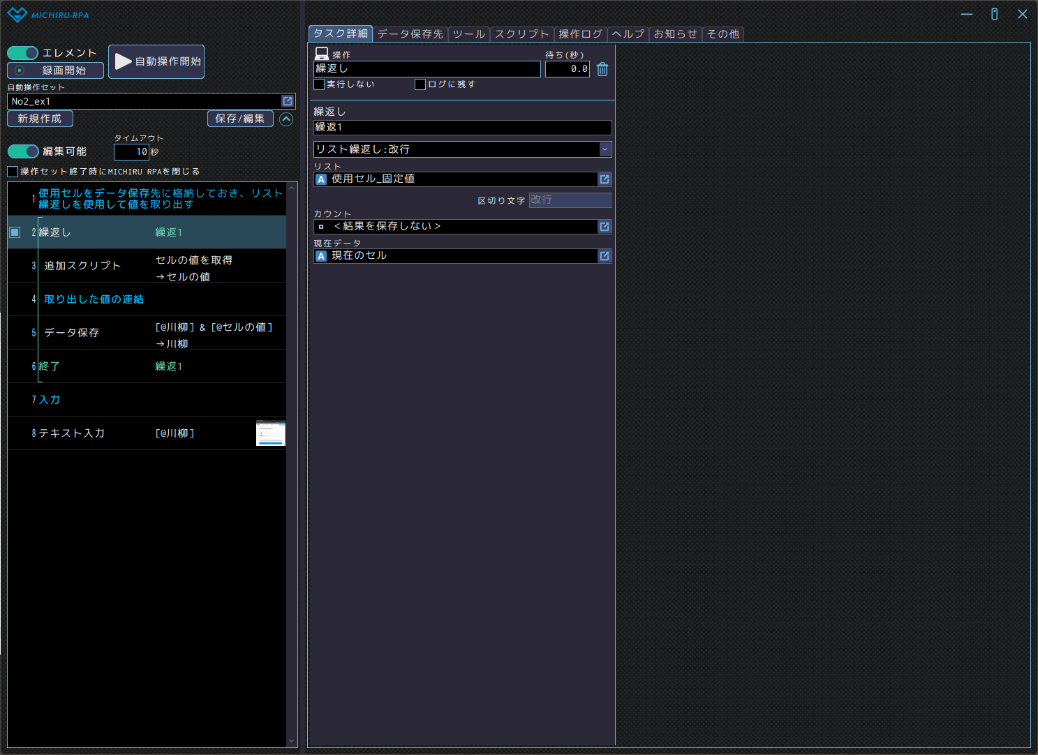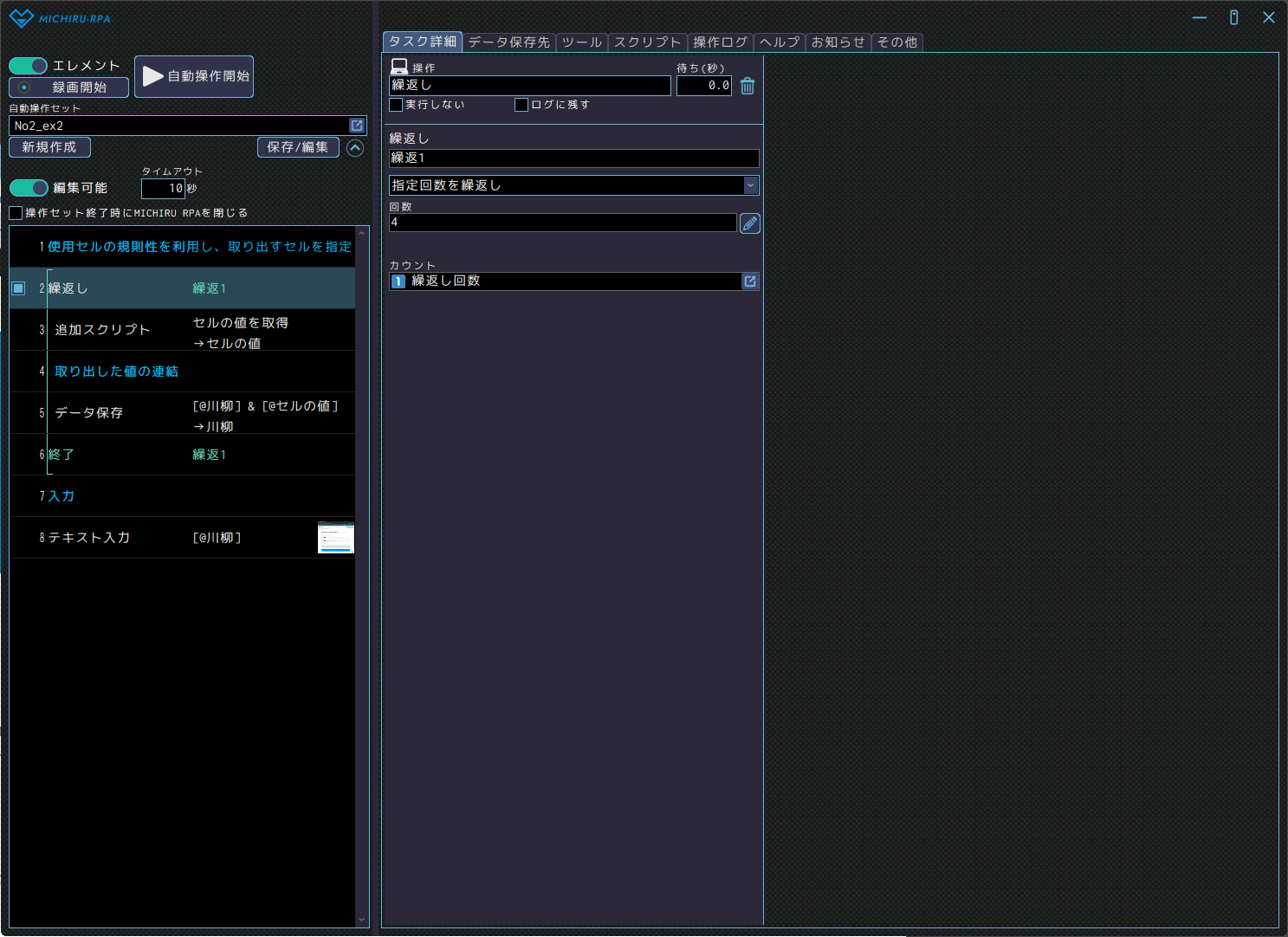 繰返し内のカウントに指定したデータ保存先には、初期値「1」から1ずつ加算された数字が入ることを考慮して計算式を作成します。