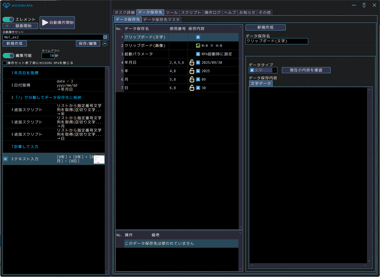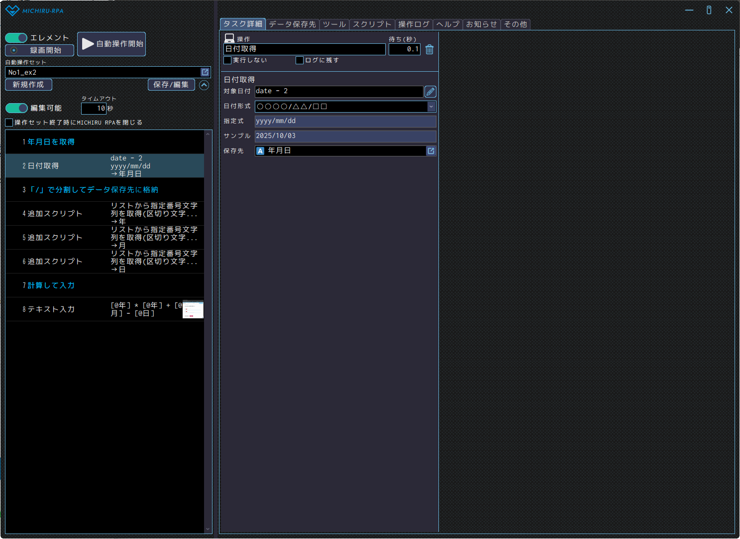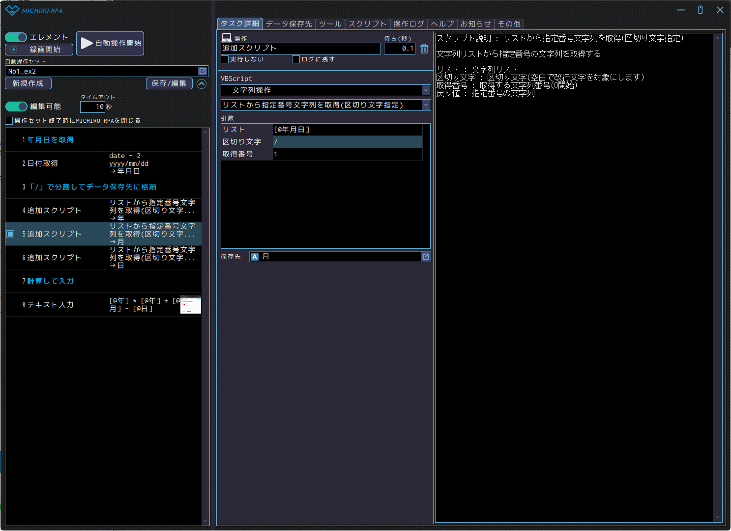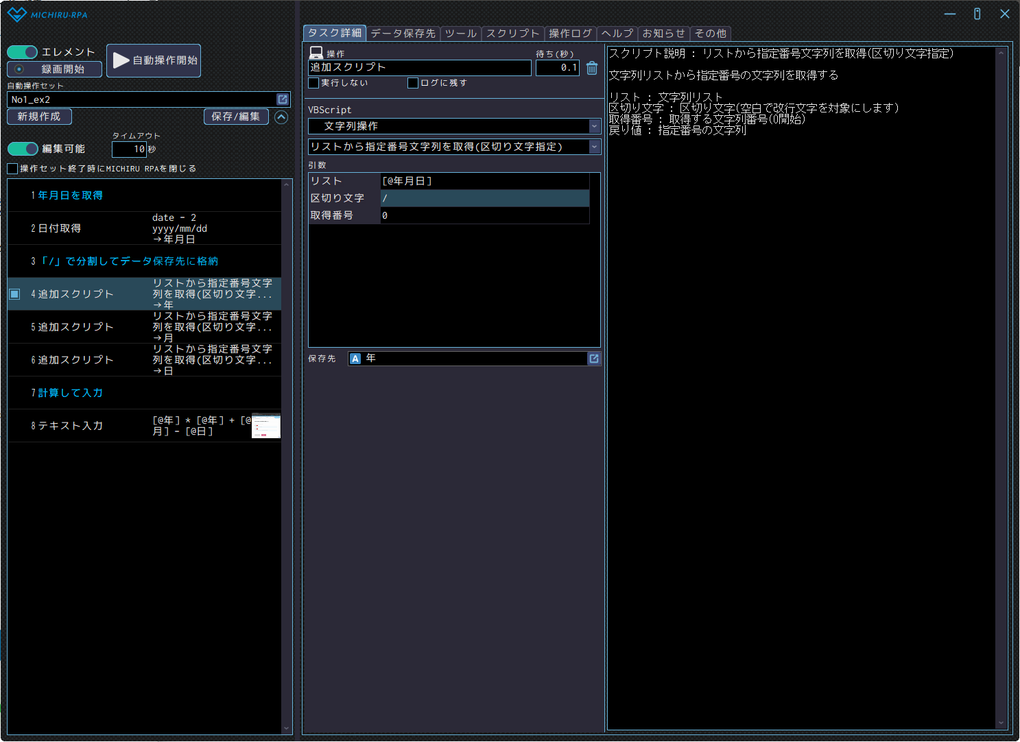 年月日の値を「日付取得」の操作を用いて取得します。その際、日付形式を「○○○○/△△/□□」としておきます。その後、文字列操作の「リストから指定番号文字列を取得(区切り文字指定)」にて区切り文字を「/」、取得番号(最初の文字は0番目となるので注意)を数字で指定し、データ保存先に格納します。