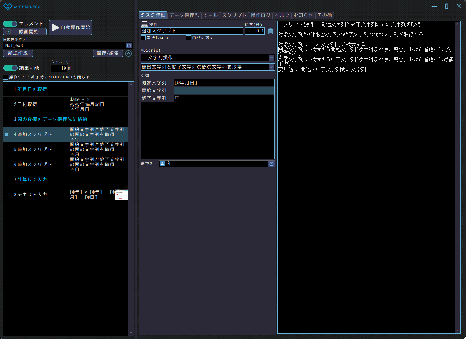 年月日の値を「日付取得」の操作を用いて取得します。その際、日付形式を「○○○○年△△月□□日」としておきます。その後、文字列操作の「開始文字列と終了文字列の間の文字列を取得」にて開始文字列と終了文字列を指定し、データ保存先に格納します。
