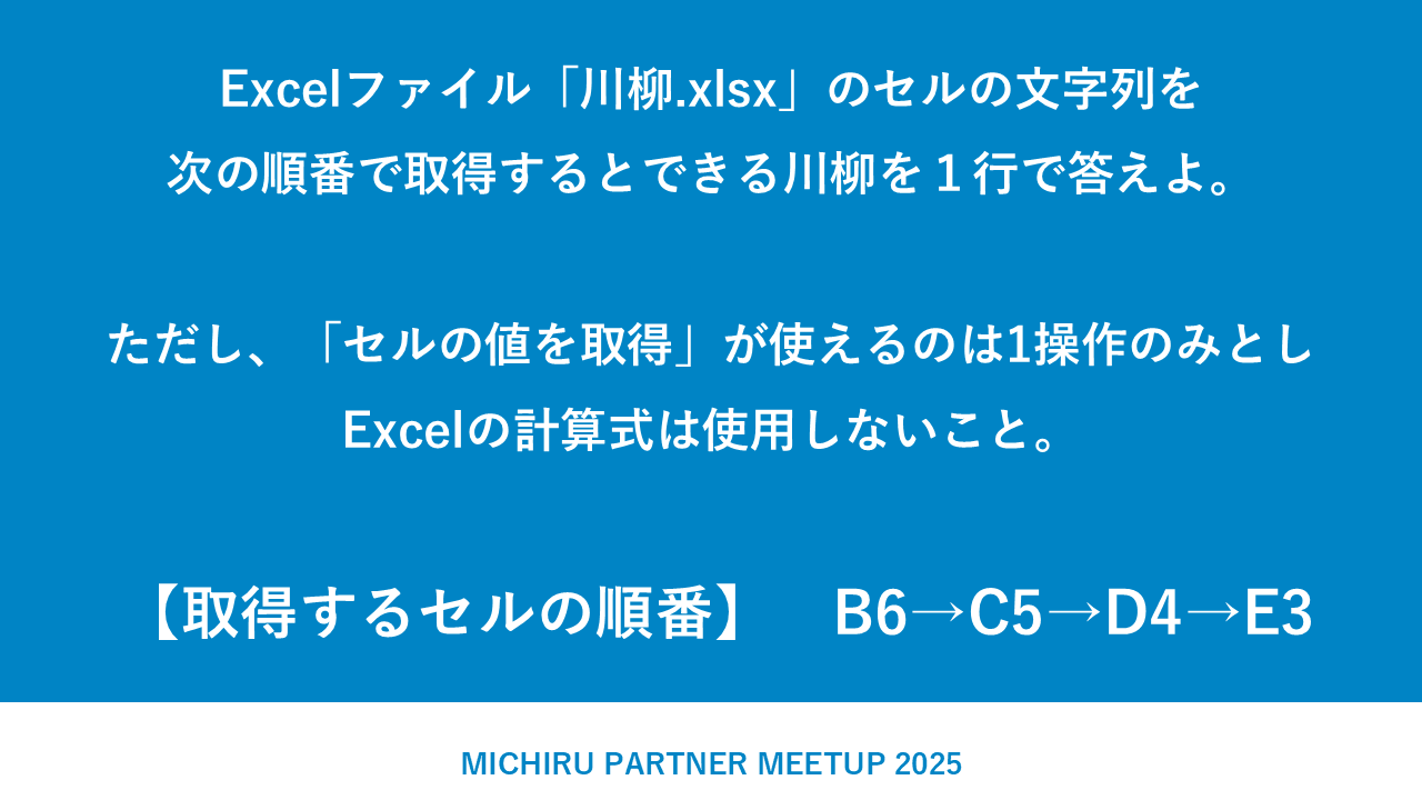本問題は、Excelから指定されたセルの値を取得し、それらを文字列として連結して川柳を作成するという内容でした。今回は「セルの値を取得」の操作を1回のみ使用できるという制約があるため、値の取り出しには工夫が求められます。以下に代表的な例をご紹介いたします。