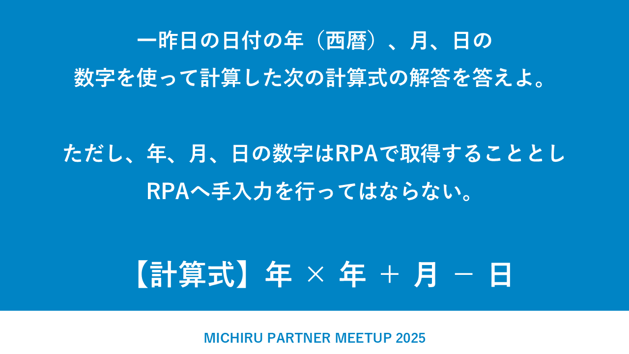 本問題は、RPA内で一昨日の日付を取得し、その年(西暦)・月・日を用いて「年×年+月−日」の値を算出するという内容でした。日付の取得方法や分割方法には複数のアプローチがありますので、代表的な例をご紹介いたします。