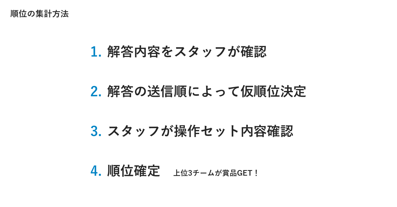 正答したチームのうち、解答用フォームの送信が早かった順に、1位から3位までのチームが入賞となります。
