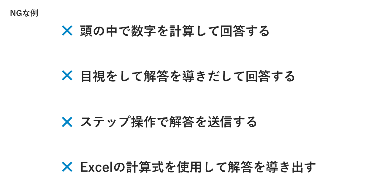 頭の中で数字を計算して解答したり、目視判断で解答を手入力することは禁止です。