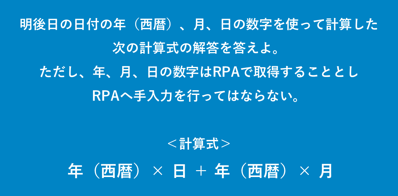 例)明後日の日付の年(西暦)・月・日の数字を使って計算した次の計算式の解答を答えよ。