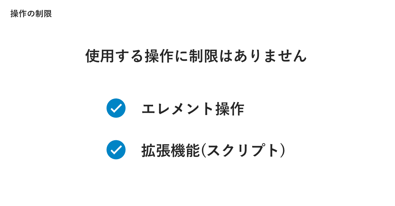 使用できる操作に制限はありません。エレメント取得モードや拡張機能(スクリプト)も利用可能です。