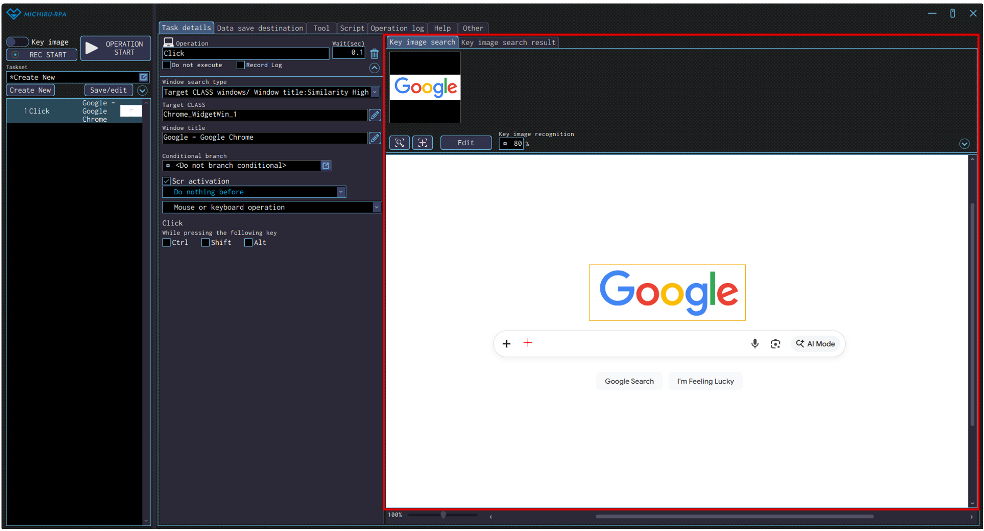 The following image shows the example where the logo of Google is set as the key image to look for (orange frame), and the input field below is set to be clicked on (red cross).