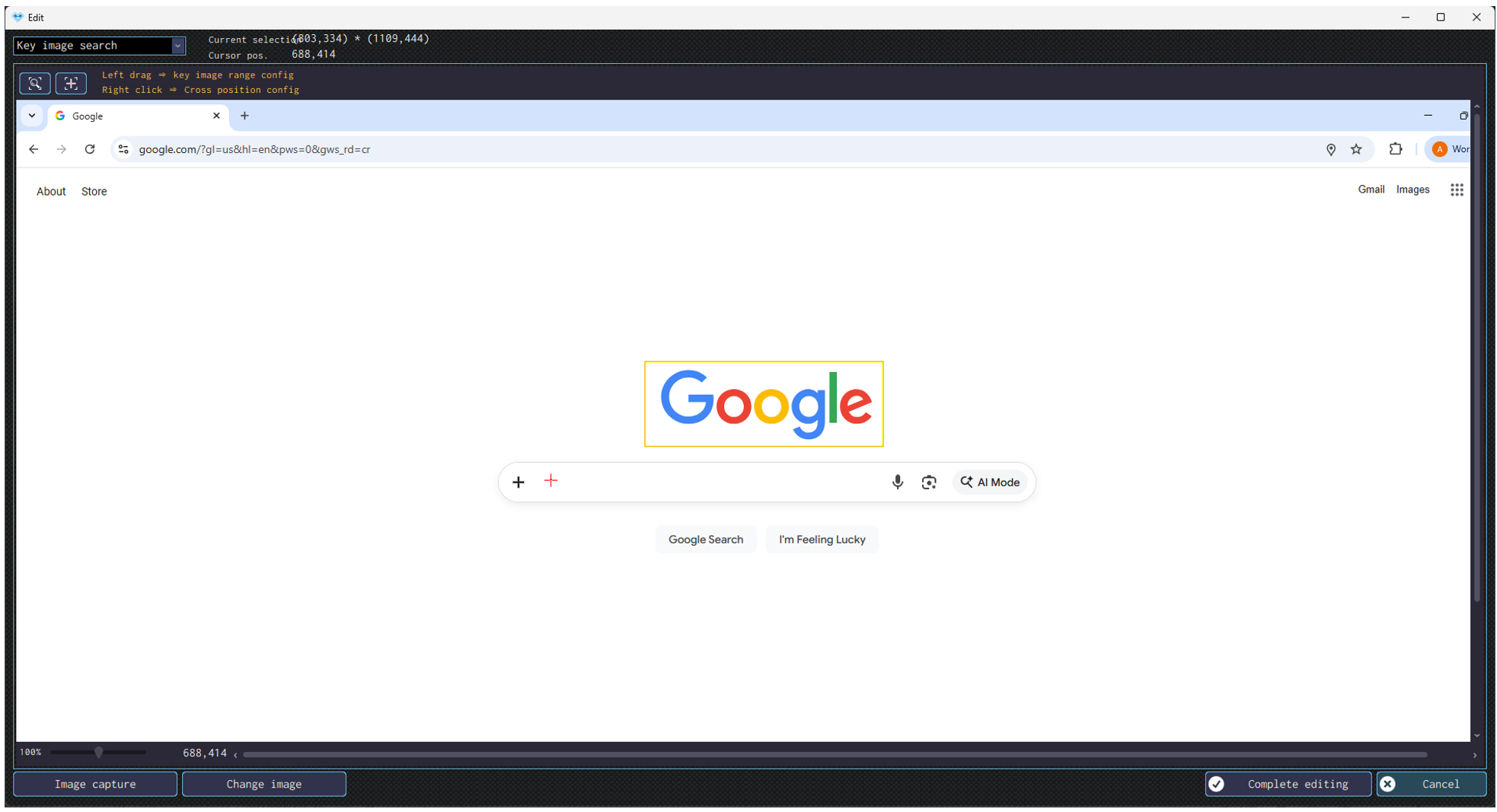The following image shows the example where element capture key is pressed when the cursor is on the search box of Google. A blue frame will be displayed around the search box.