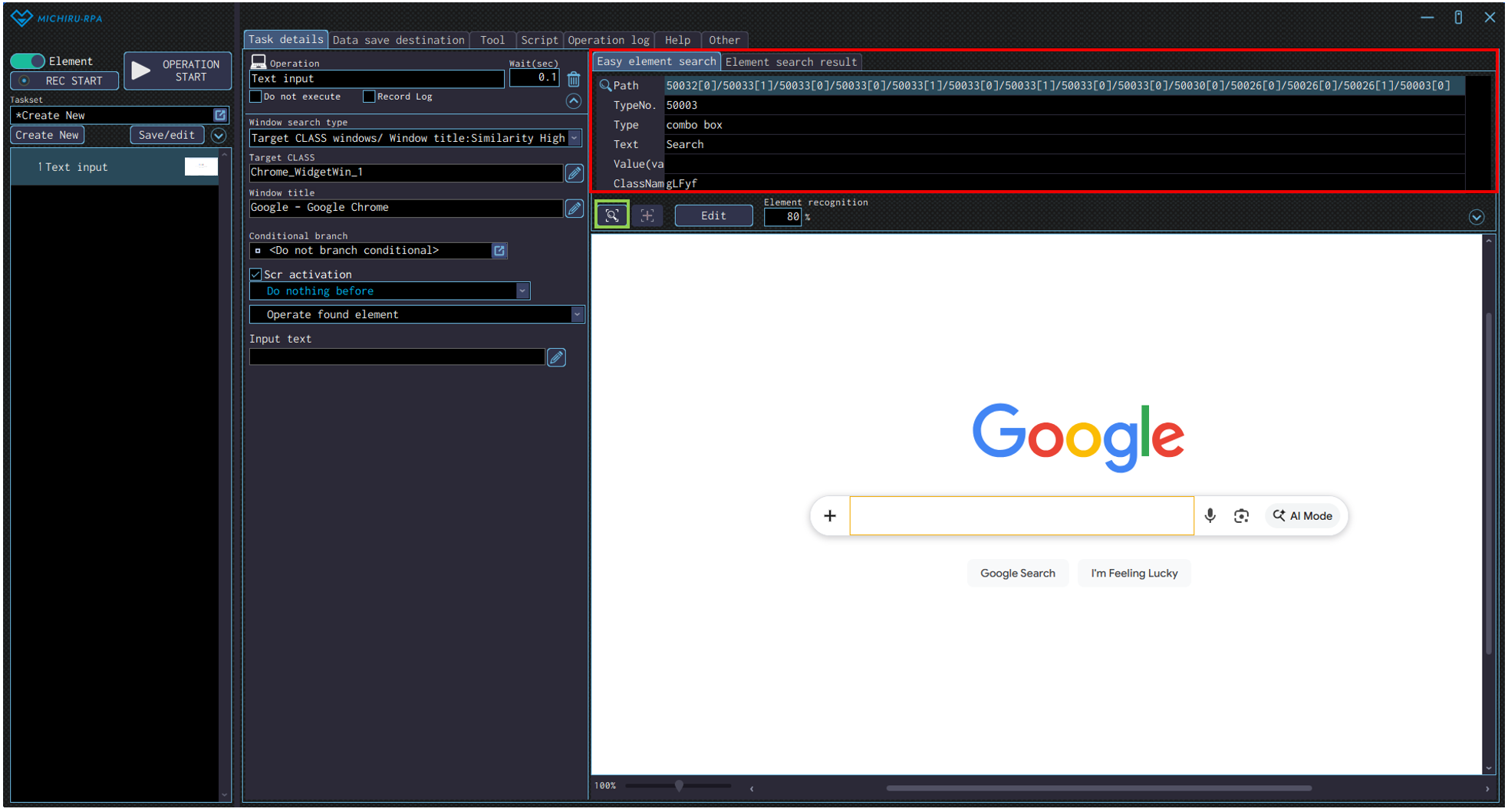 Basic Function Search standby Mouse operation Click, Double click, Triple click, Drag, Right click, Double right click, Right drag, Center click, Center double click, Center drag, Scroll mouse wheel, Scroll to find image Text operation Key input, Text input, Password input, Select from list, Select checkbox, Get element information, Get elements count, Copy all selected, Copy selected range, Paste Browser operation Click, Text input, Select from list, Select checkbox, Get element information, Get elements count, JavaScript Execution MICHIRU browser operation Click, Text input, Select from list, Select checkbox, Get element information, Get elements count, JavaScript Execution, Close page, Get page(full text), Get page(snapshot), Get page(full PDF), Print page Operations with the option to activate the screen.