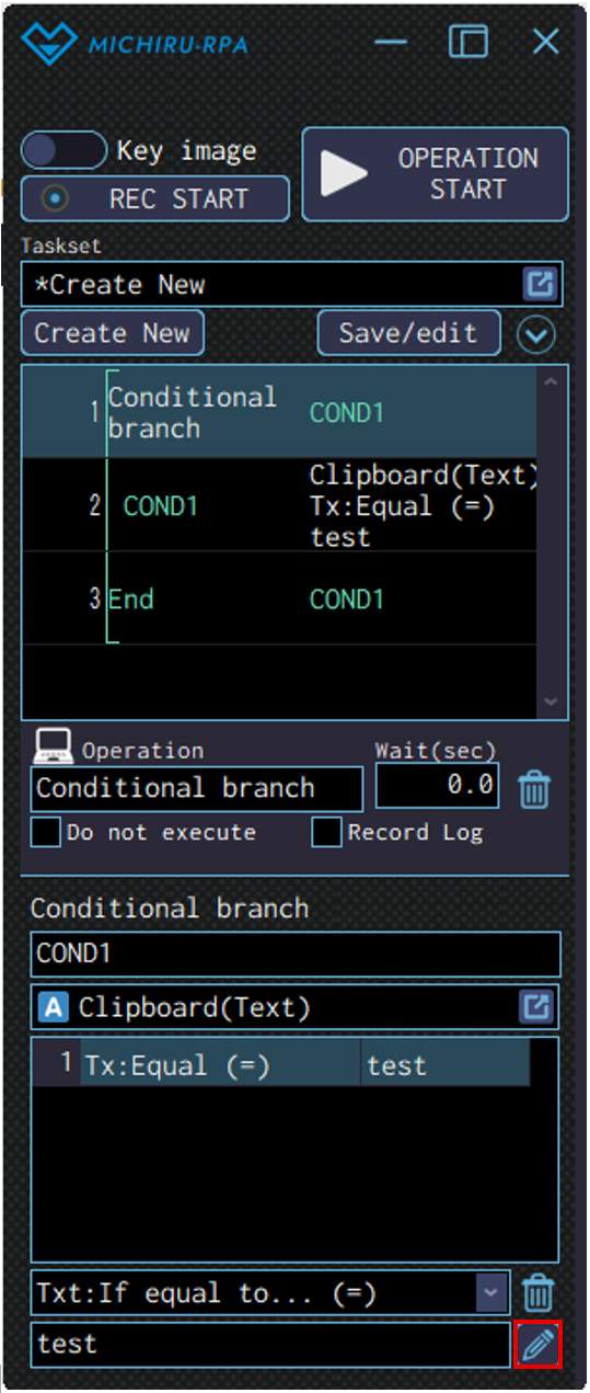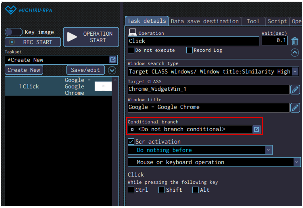 Settings available are different for each operation. Examples of detailed settings available include conditional branch within an operation, mouse action before an operation, editing formula.