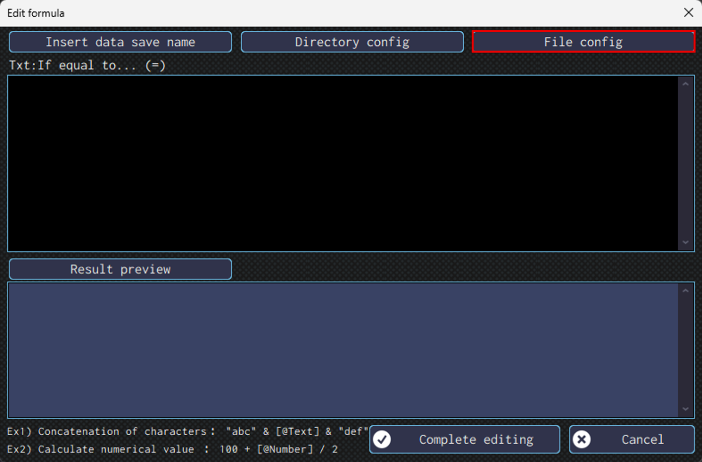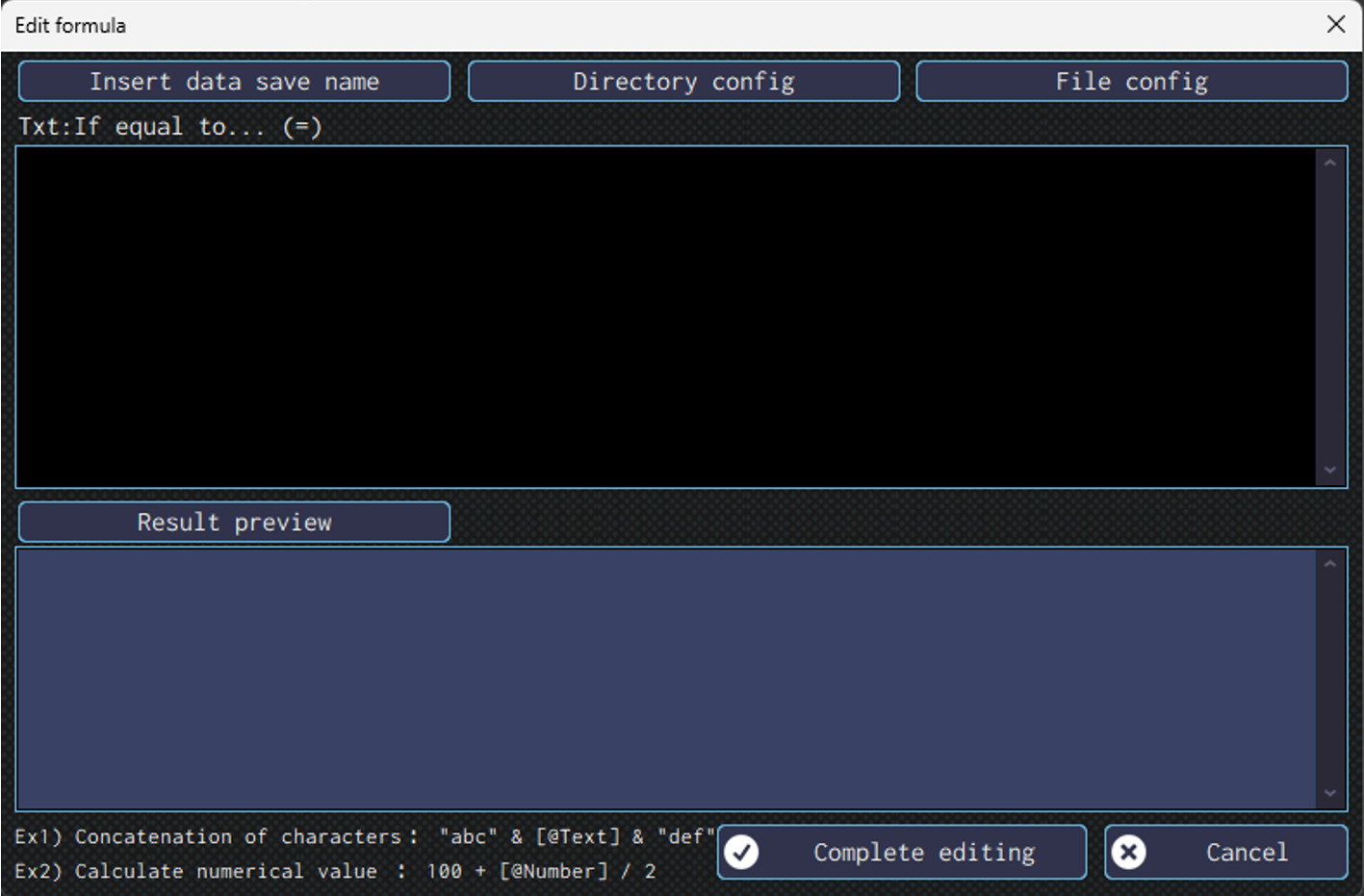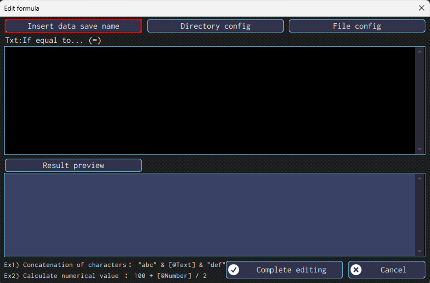 In this window, you can input formula, insert data save destination, specify a directory, and etc.