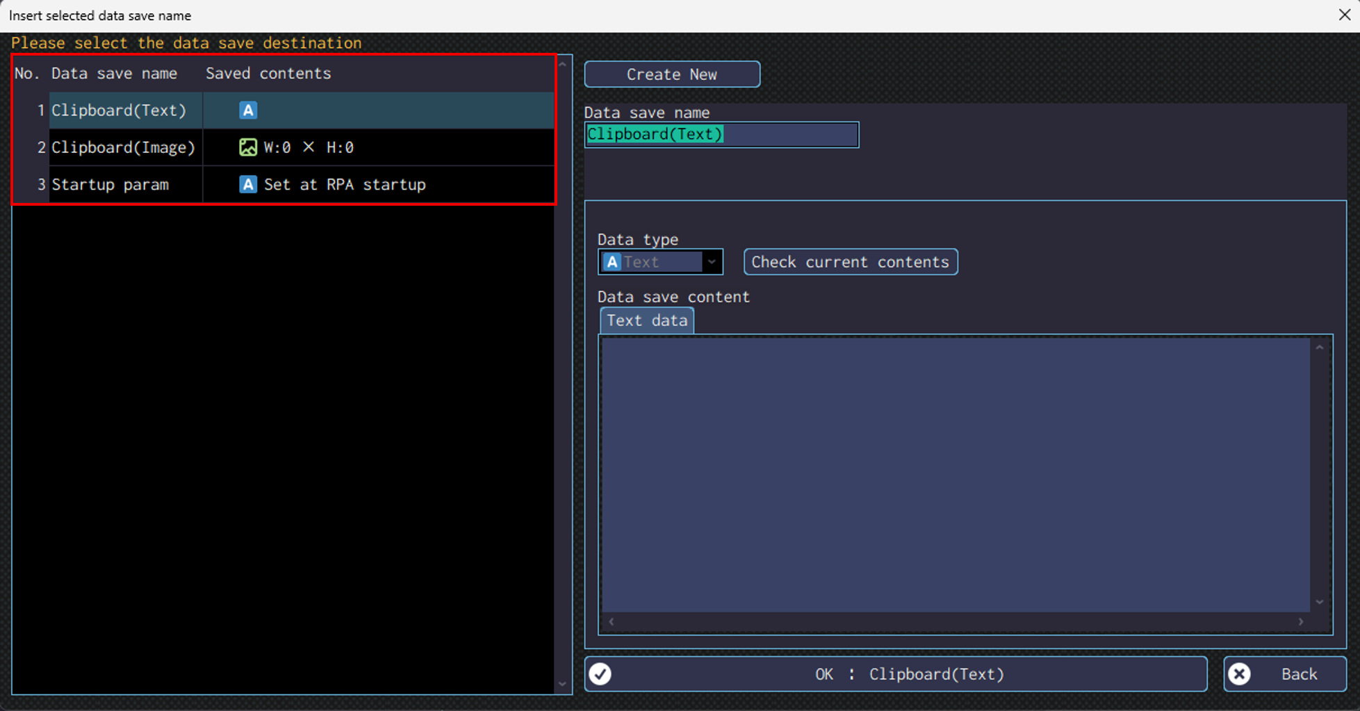 To use contents saved in the data save destination, click on the pencil icon next to the “Target window” field, and select the relevant data save name from “Insert data save name”.