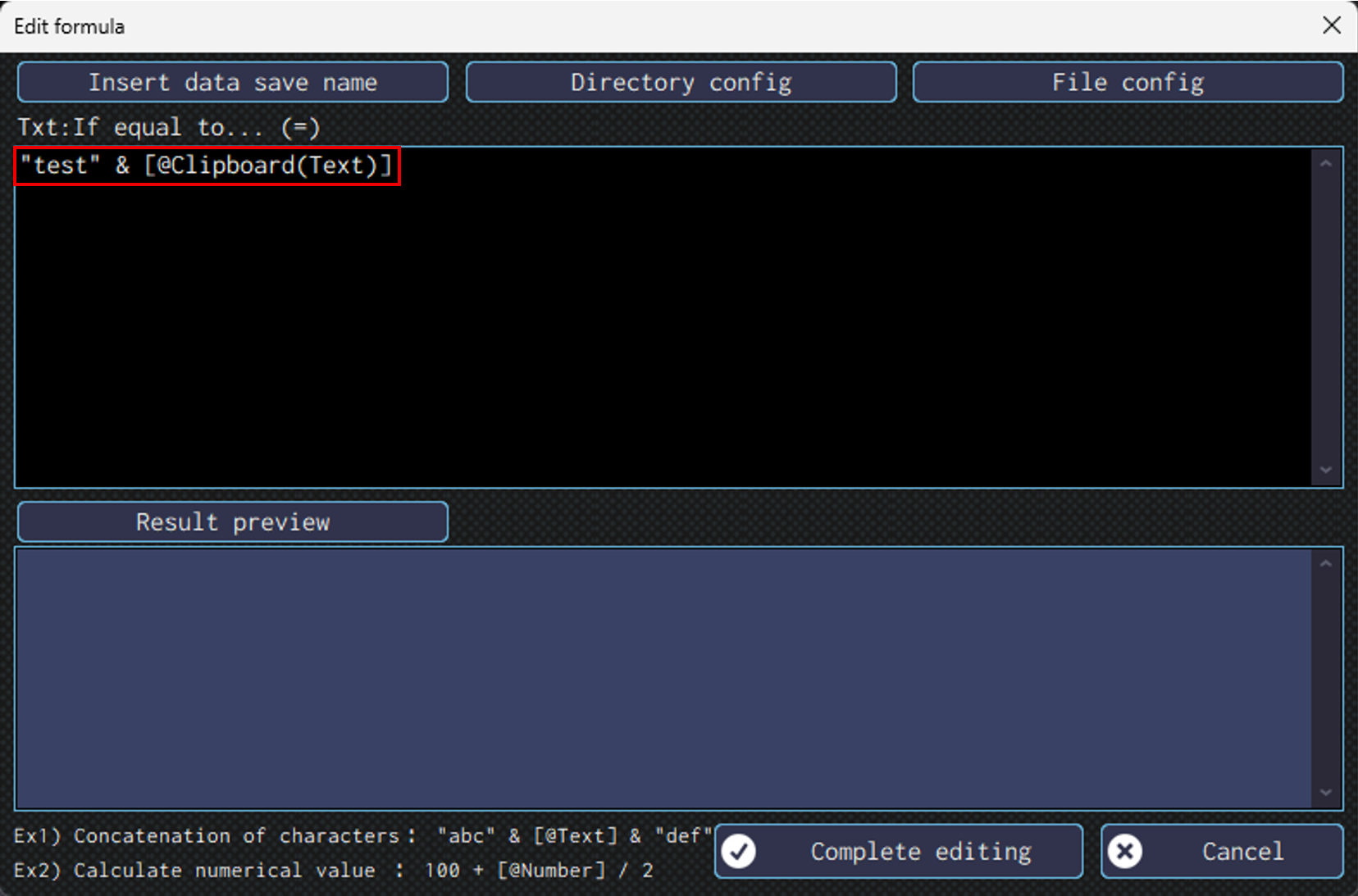 Clicking the “Result preview” in the “Edit formula” screen will display the result if the formula specified in the editor.