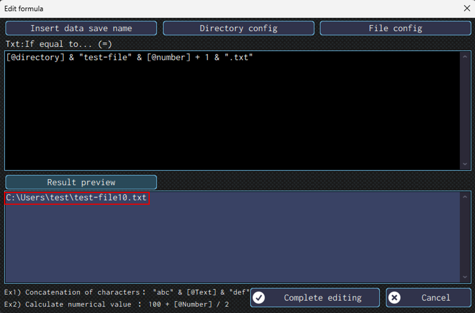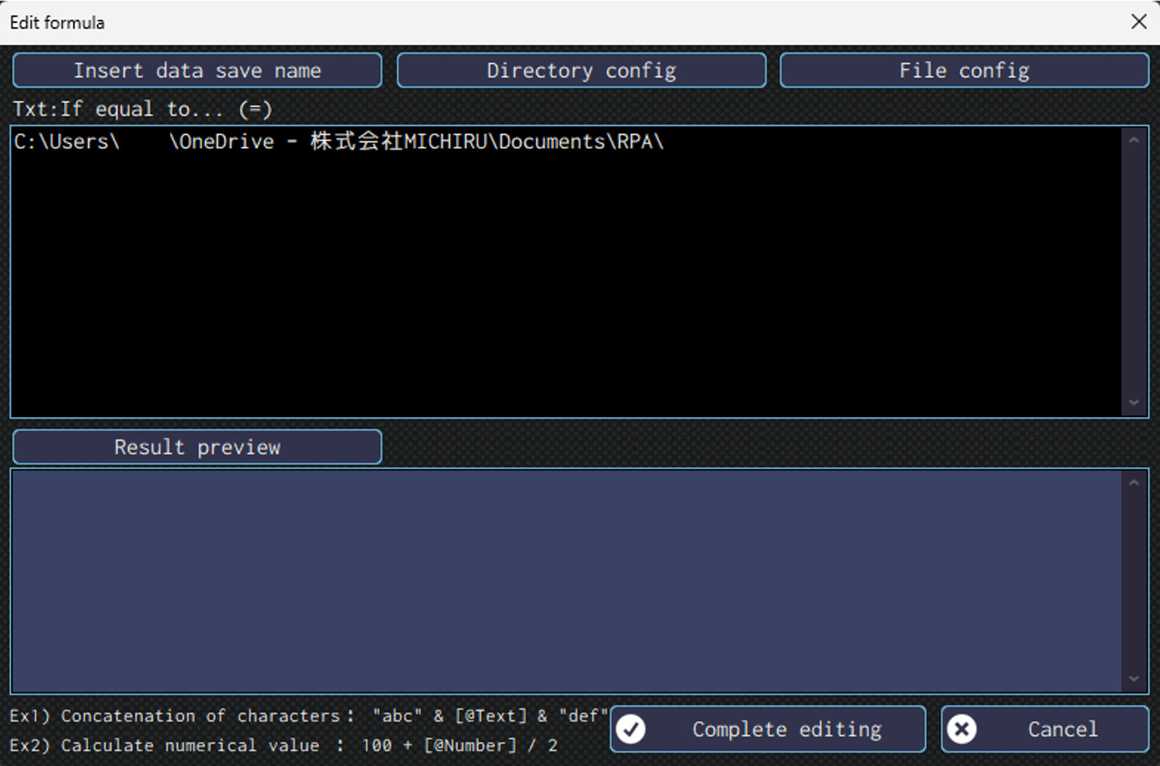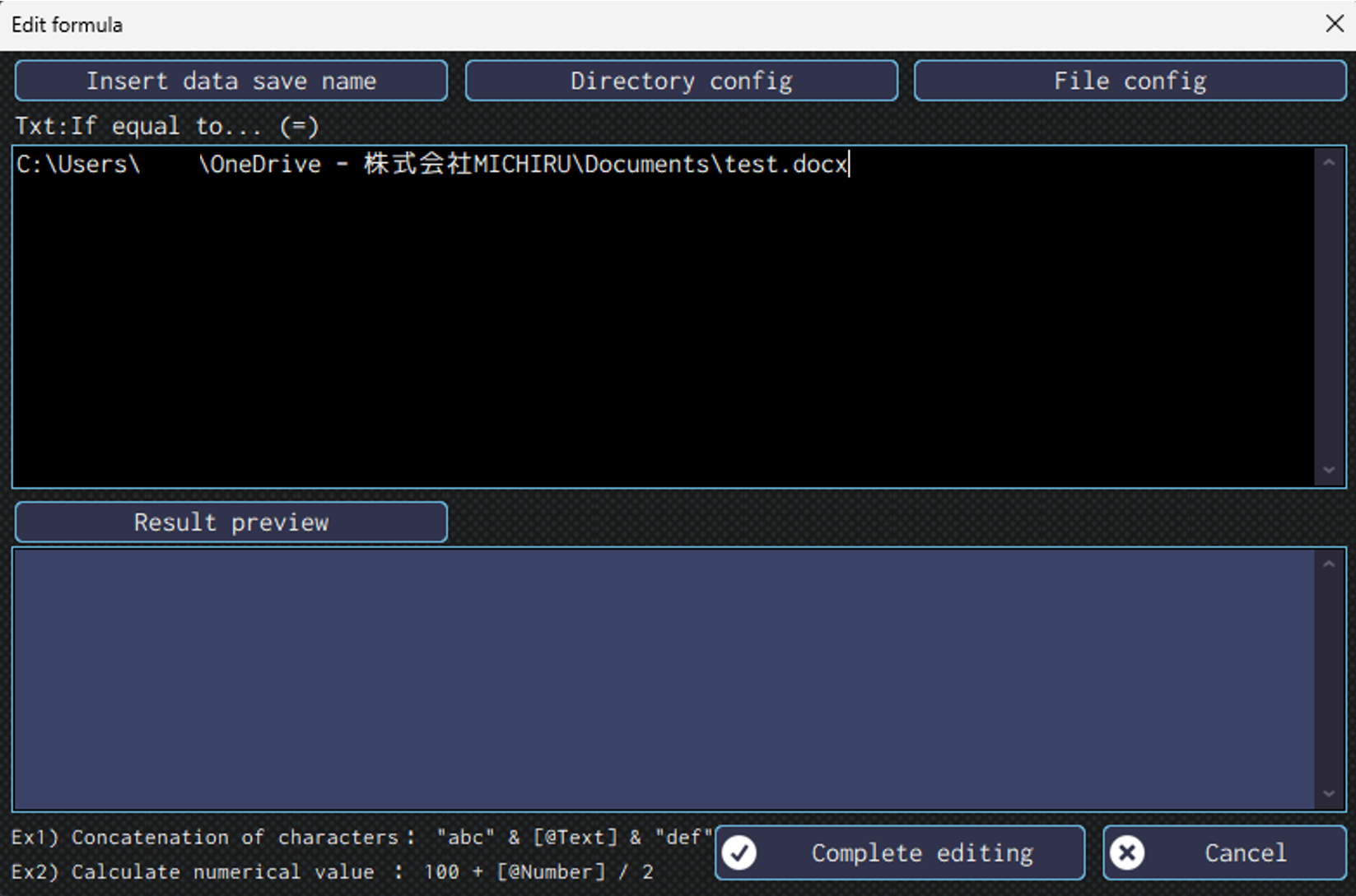 After selecting, folder path for the specified directory will appear in the “Edit formula” screen.