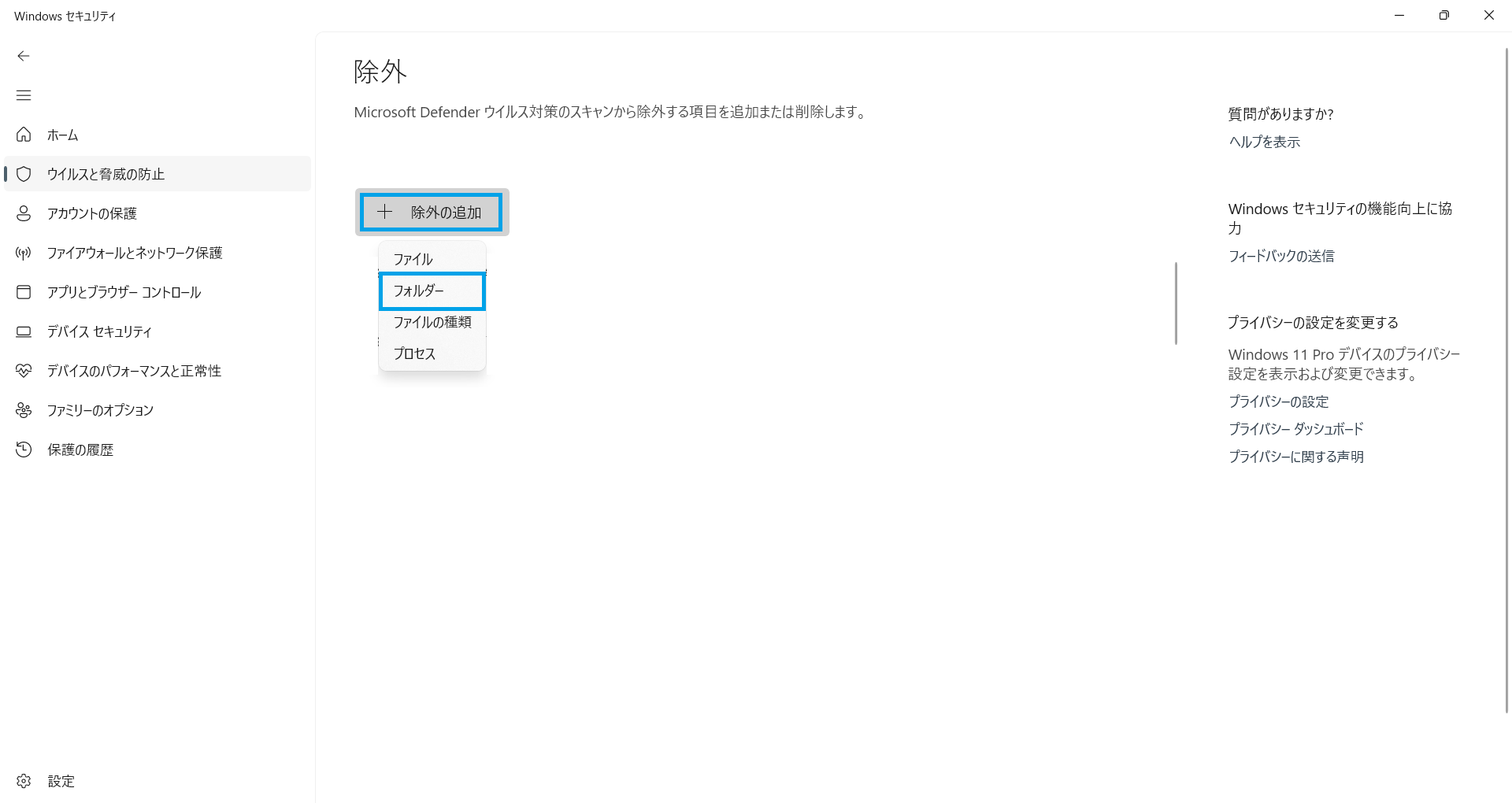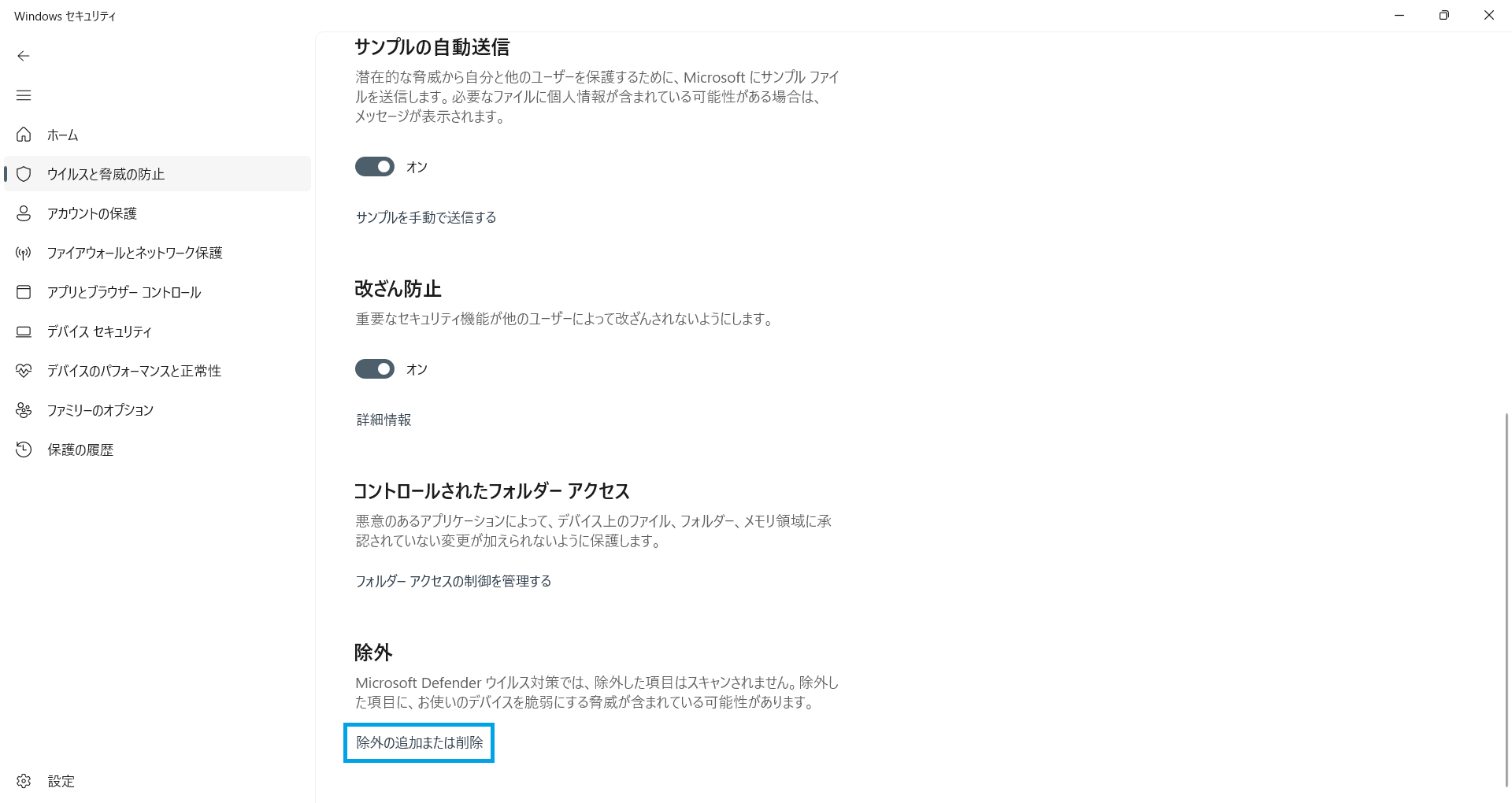 画面を下にスクロールし、「除外」項目の「除外の追加または削除」をクリックします。
