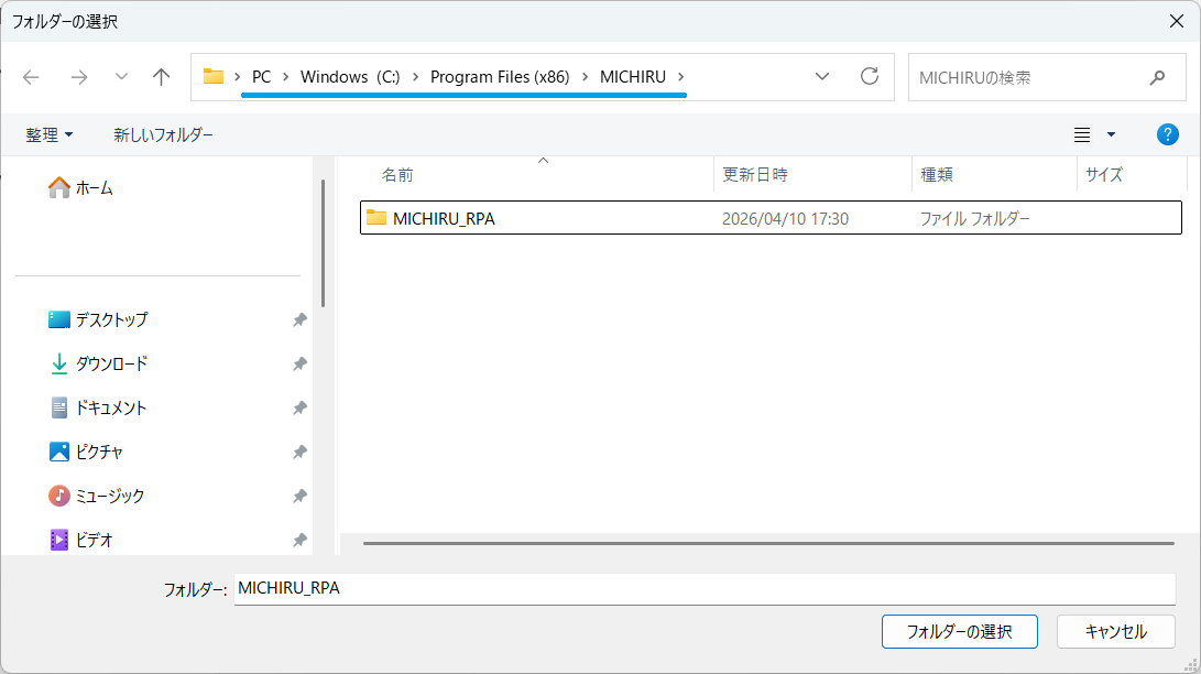 MICHIRU RPAのインストールフォルダを選択し、追加します。C:\Program Files (x86)\MICHIRU\MICHIRU_RPA