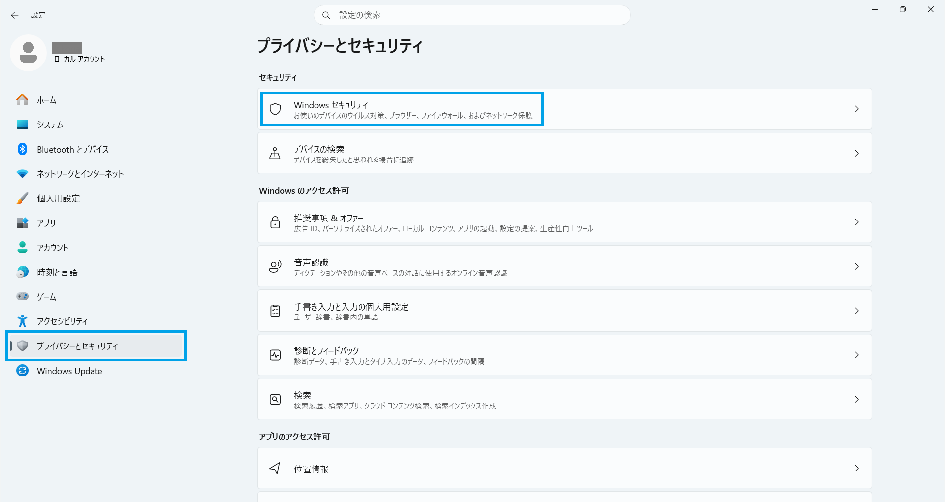 該当の項目が見つからない場合は、Windows設定画面内の検索機能をご利用ください。