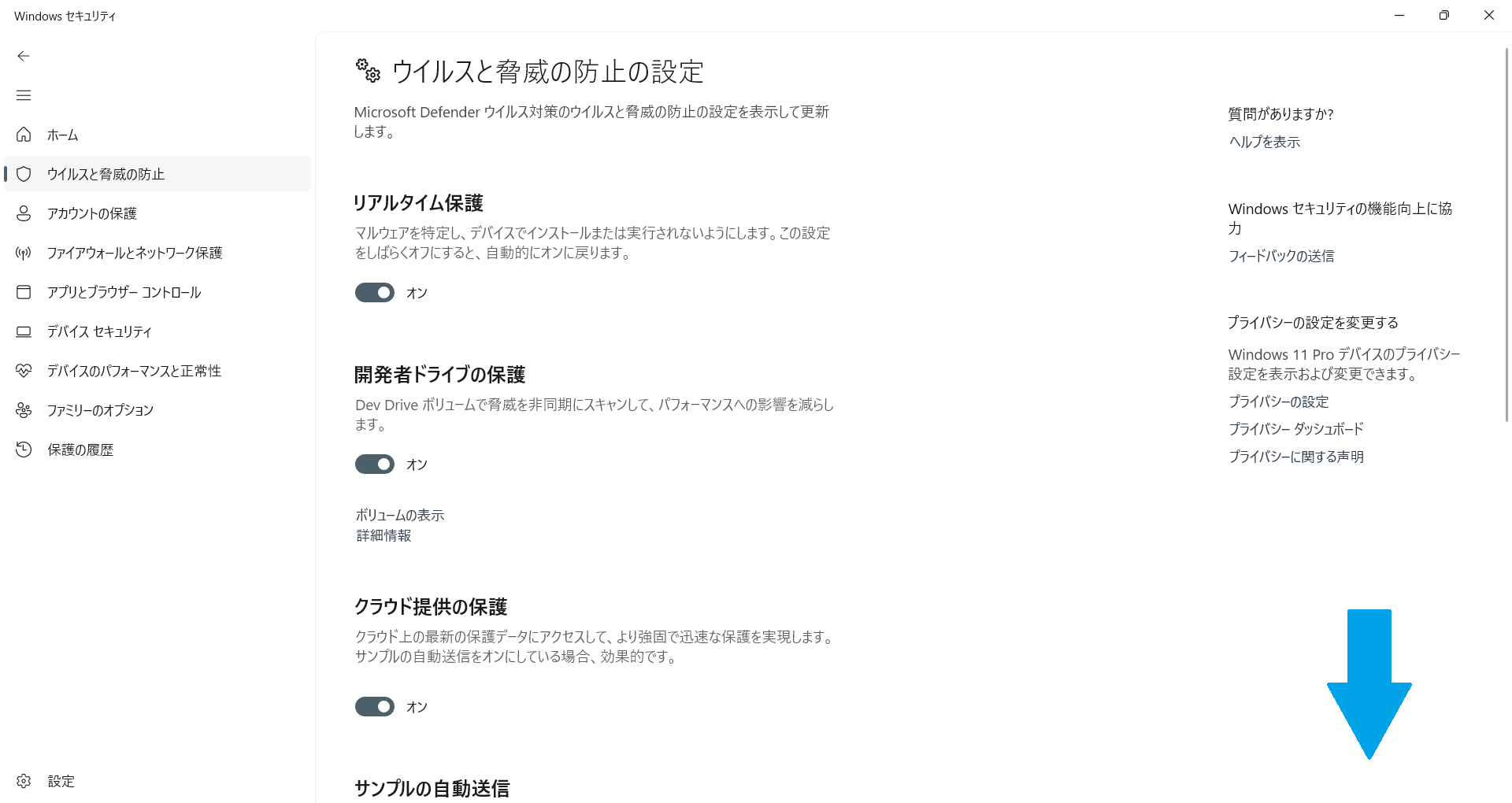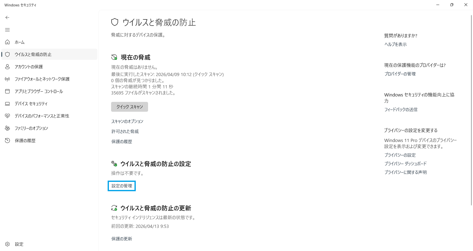 「ウイルスと脅威の防止」内の「設定の管理」をクリックします。