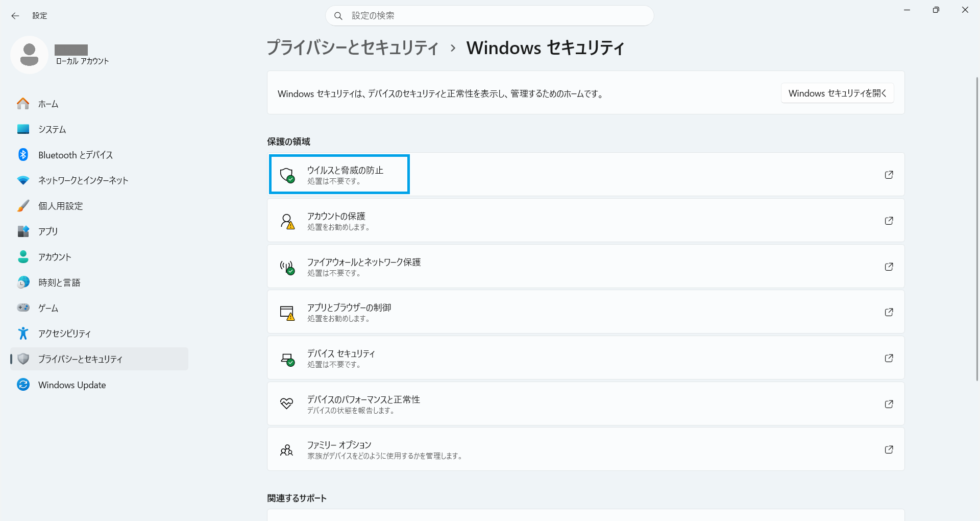 「Windows セキュリティ」内の「ウイルスと脅威の防止」をクリックします。